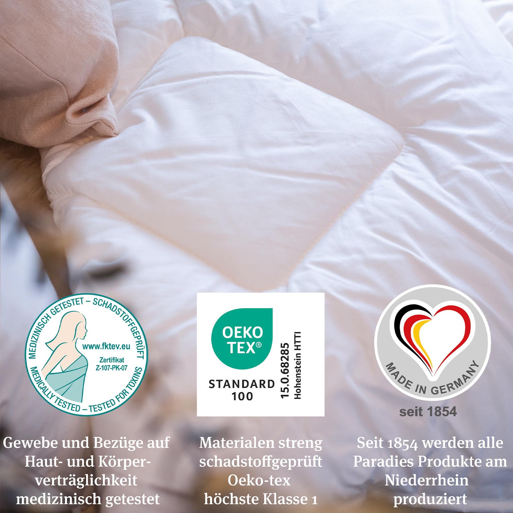 Die Decke kombiniert Komfort mit Nachhaltigkeit. Der Bezug besteht aus 100% Paradies Greentex Bio-Baumwolle aus kontrolliert biologischem Anbau. Die Füllung ist eine GRS-zertifizierte Textilfaser (Paradies Fill, 100% Polyester), die zu 50% aus rezyklierten Materialien hergestellt wird.