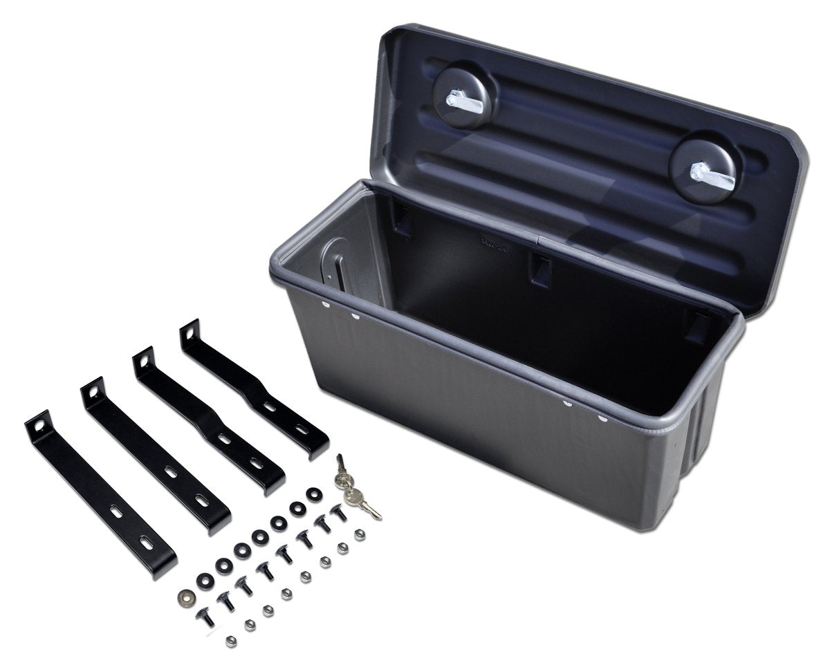 Dieser hochwertige Werkzeugkasten aus langlebigem Kunststoff bietet eine sichere und wetterfeste Aufbewahrungslösung für Ihre Werkzeuge und Ausrüstung. Er wird als komplettes Set mit dem passenden Halter geliefert und ist somit direkt für die Montage bereit.