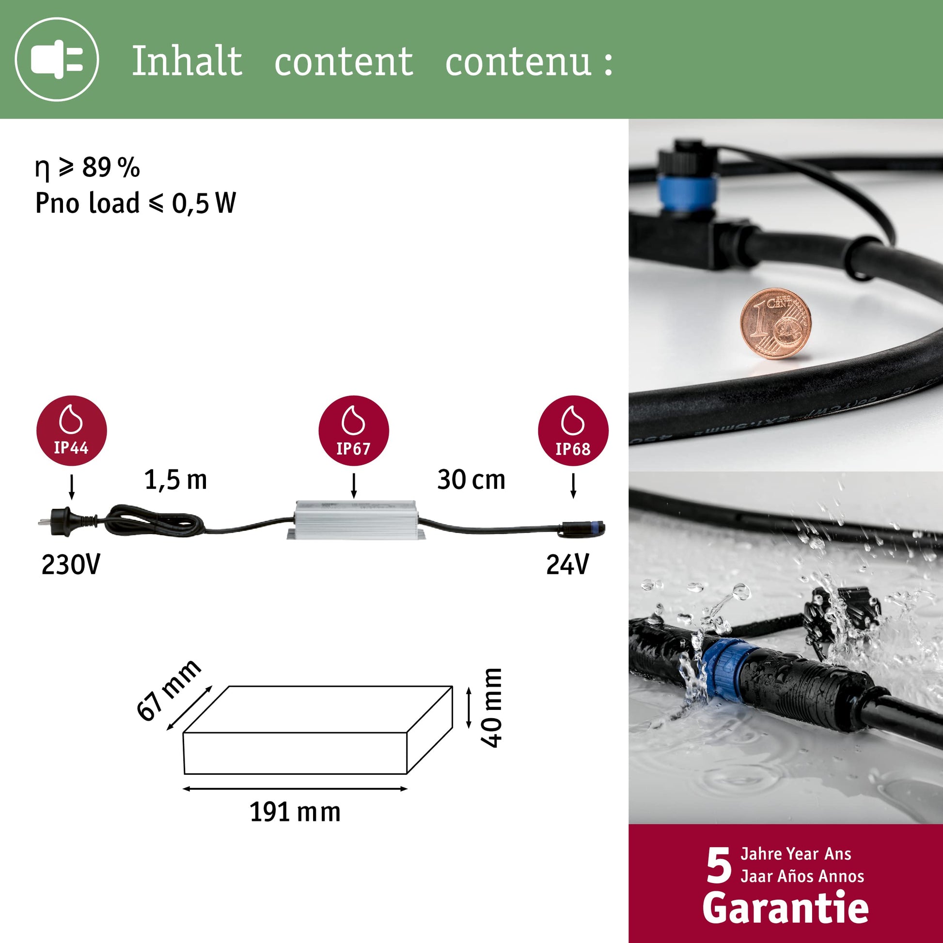 Dieses 24V-Netzteil ist die zentrale Stromversorgung und damit das Herzstück Ihrer individuellen Aussenbeleuchtung mit dem Plug&Shine System.