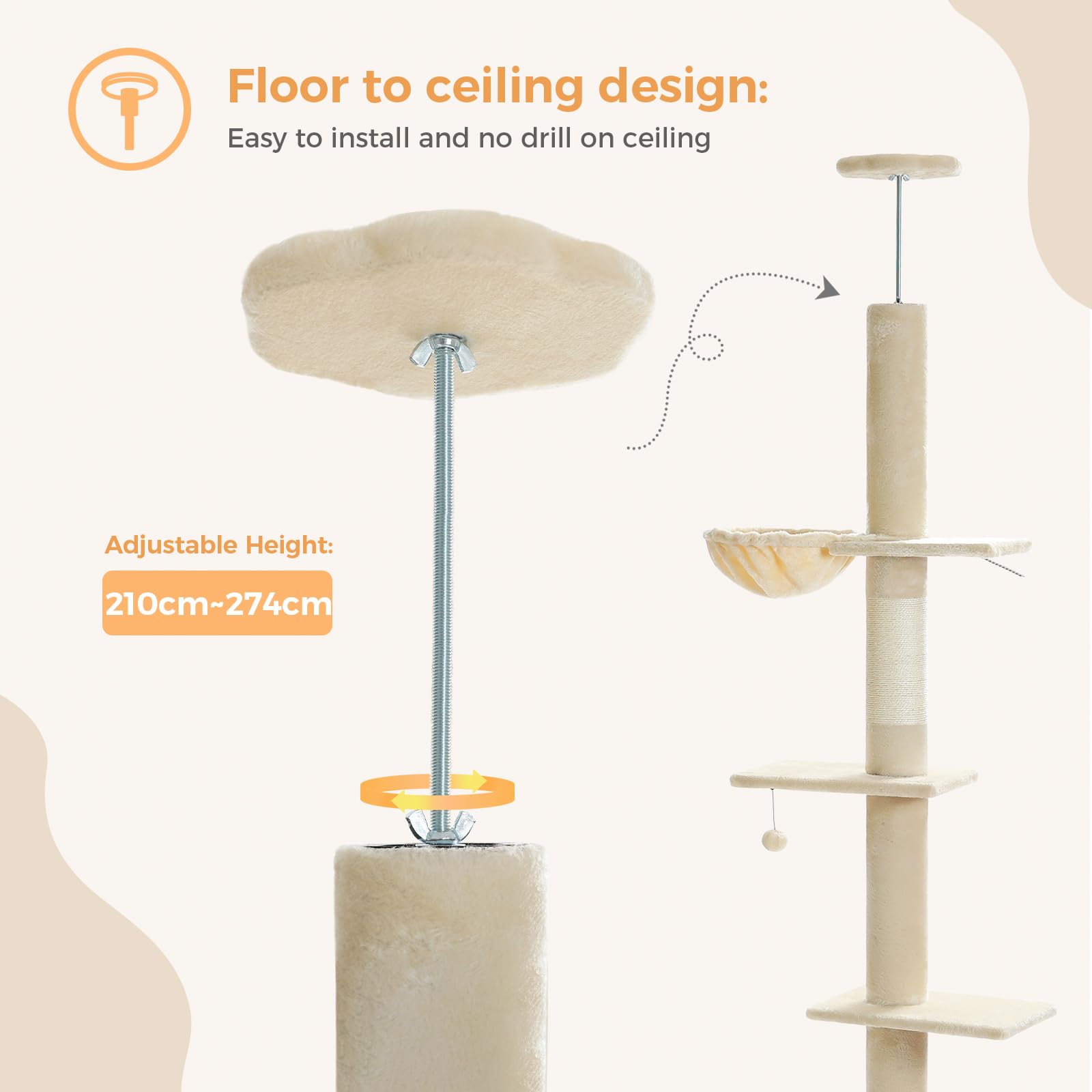 Der Kratzbaum ist für Deckenhöhen von 216 cm bis 273 cm konzipiert. Dank der mitgelieferten Stangen in verschiedenen Längen (20 cm, 30 cm, 44 cm) können Sie ihn stufenlos und flexibel an Ihre genaue Raumhöhe anpassen.