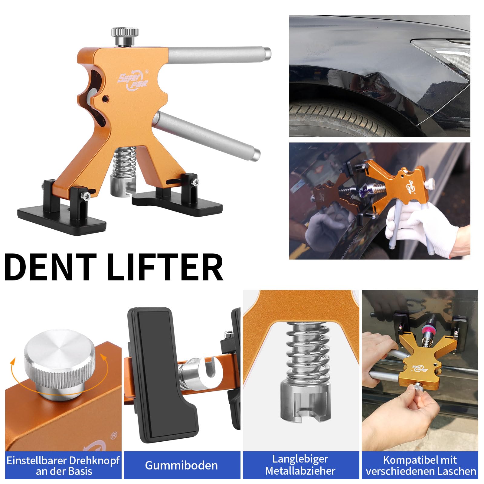 - Vielseitige Werkzeuge: Das Set beinhaltet einen kräftesparenden Brücken-Ausbeulzieher für flachere Dellen sowie einen 2-in-1-Gleithammer, der auch tiefe oder grosse Beulen an dickerem Blech kraftvoll herauszieht.