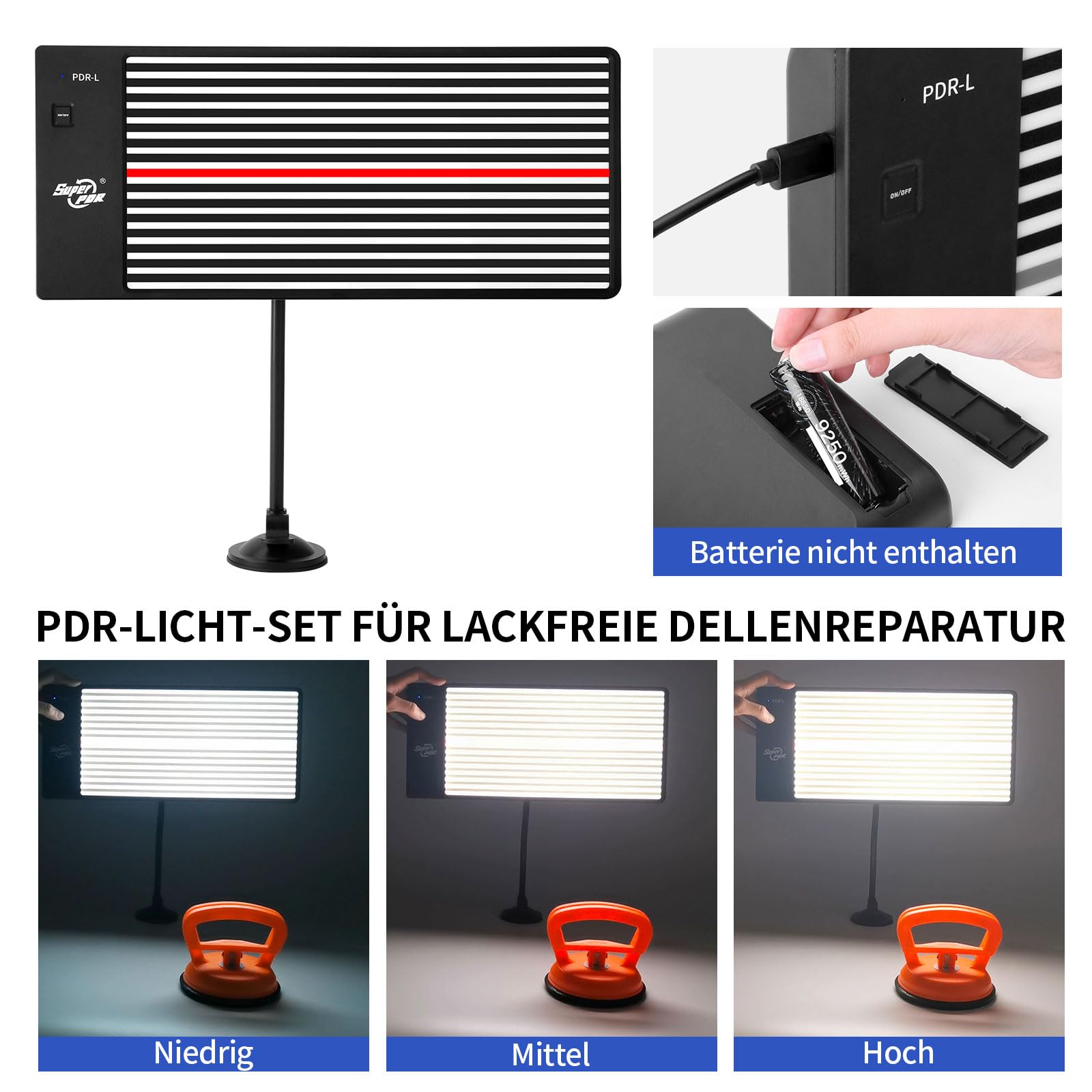 - USB-LED-Ausbeulbrett: Ein beleuchtetes Kontrollbrett mit drei einstellbaren Helligkeitsstufen macht selbst kleinste Unebenheiten sichtbar. Dies ermöglicht ein präzises Inspizieren und Reparieren der Karosserieschäden, selbst in dunklerer Umgebung (benötigt Akku Typ 16850, nicht enthalten).