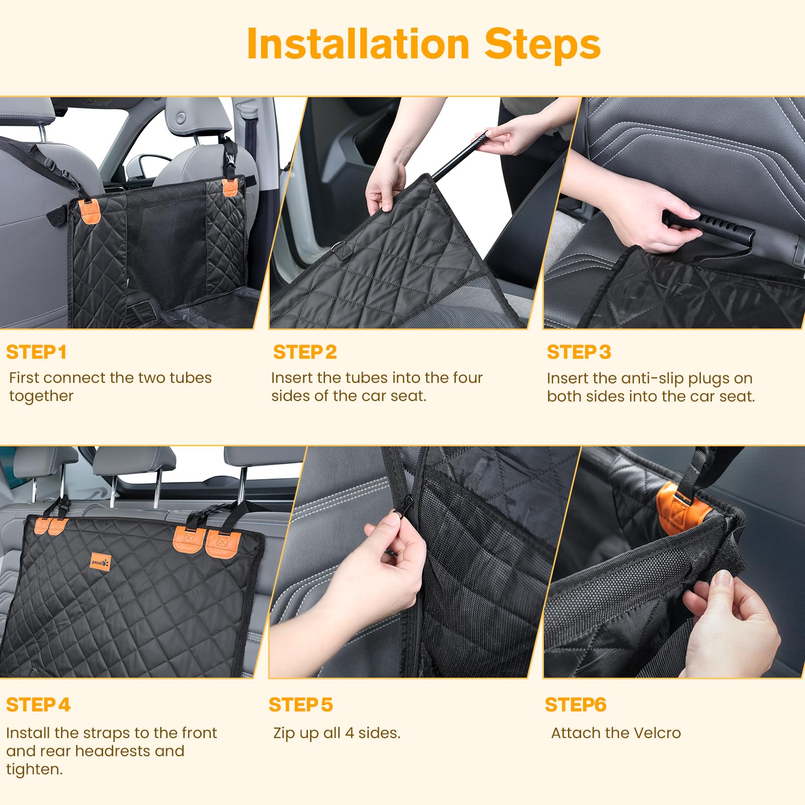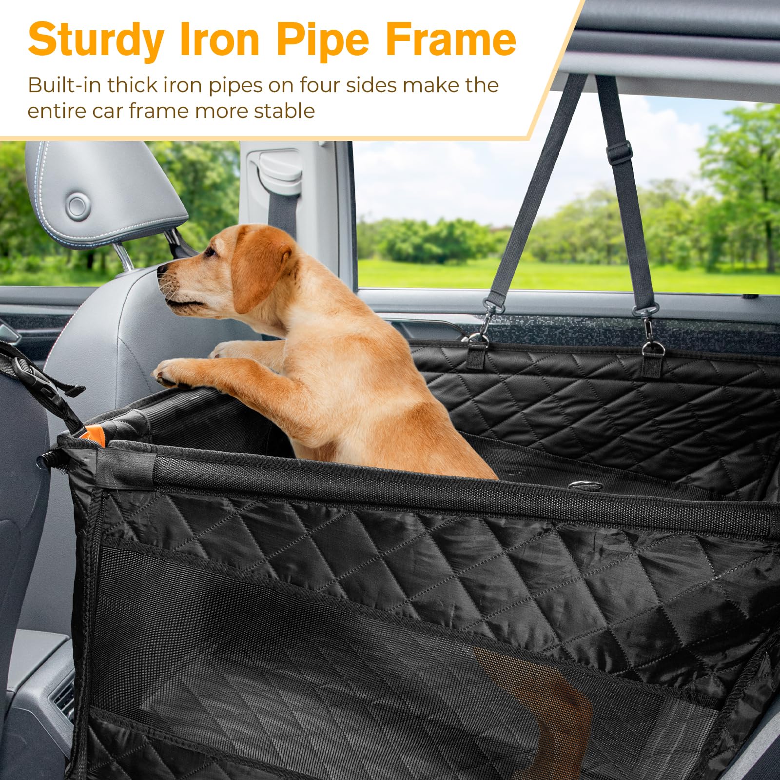 Der Sitz wird durch einen Stahlrohrrahmen und vier Befestigungsgurte extrem stabil im Auto fixiert. Im Inneren befindet sich eine verstellbare Sicherheitsleine (nicht im Lieferumfang des Originaltextes erwähnt, aber ein Standardmerkmal solcher Produkte), die Sie am Geschirr Ihres Hundes befestigen, um ihn sicher an seinem Platz zu halten.