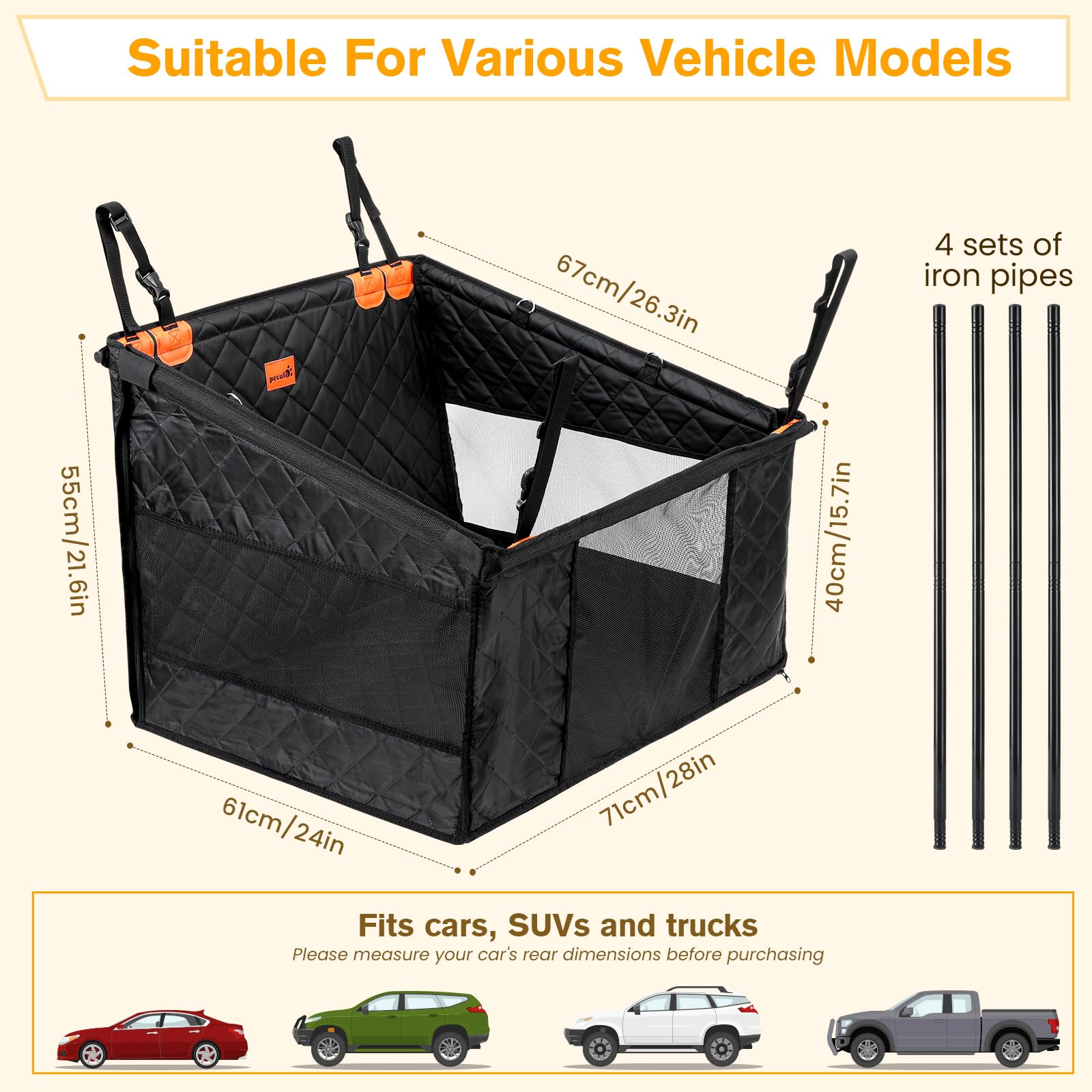- Erhöhte Seitenwände: Speziell geformte, erhöhte Seiten schützen die Autotüren vor Kratzern und verhindern, dass der Hund während der Fahrt aus dem Sitz springt.