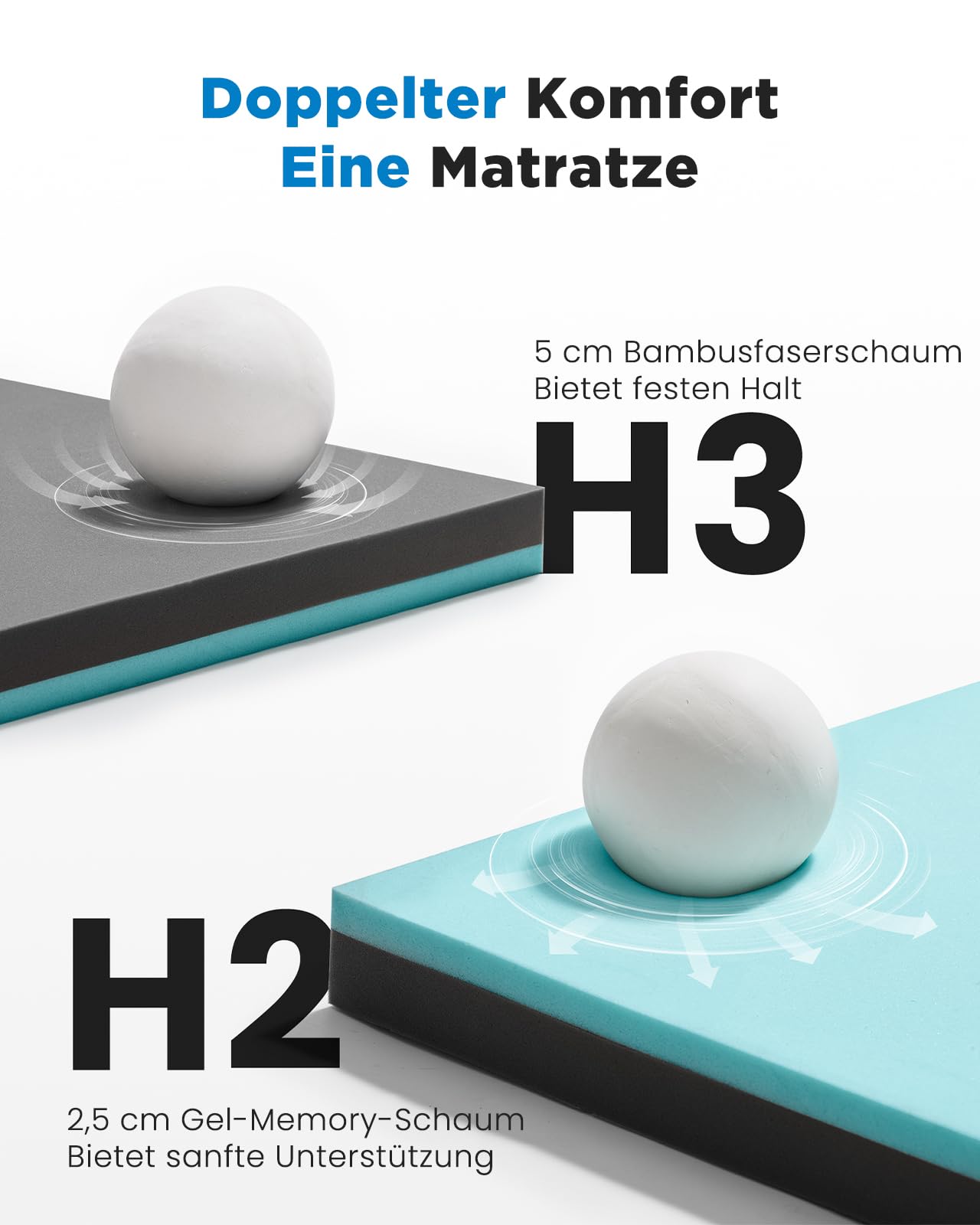 - Wendbarer Kern mit zwei Härtegraden: Wählen Sie zwischen der weicheren H2-Seite aus Gel-Viscoschaum für sanftes Einsinken und der festeren H3-Seite aus Stützschaum mit Bambusfasern für stabilen Halt.