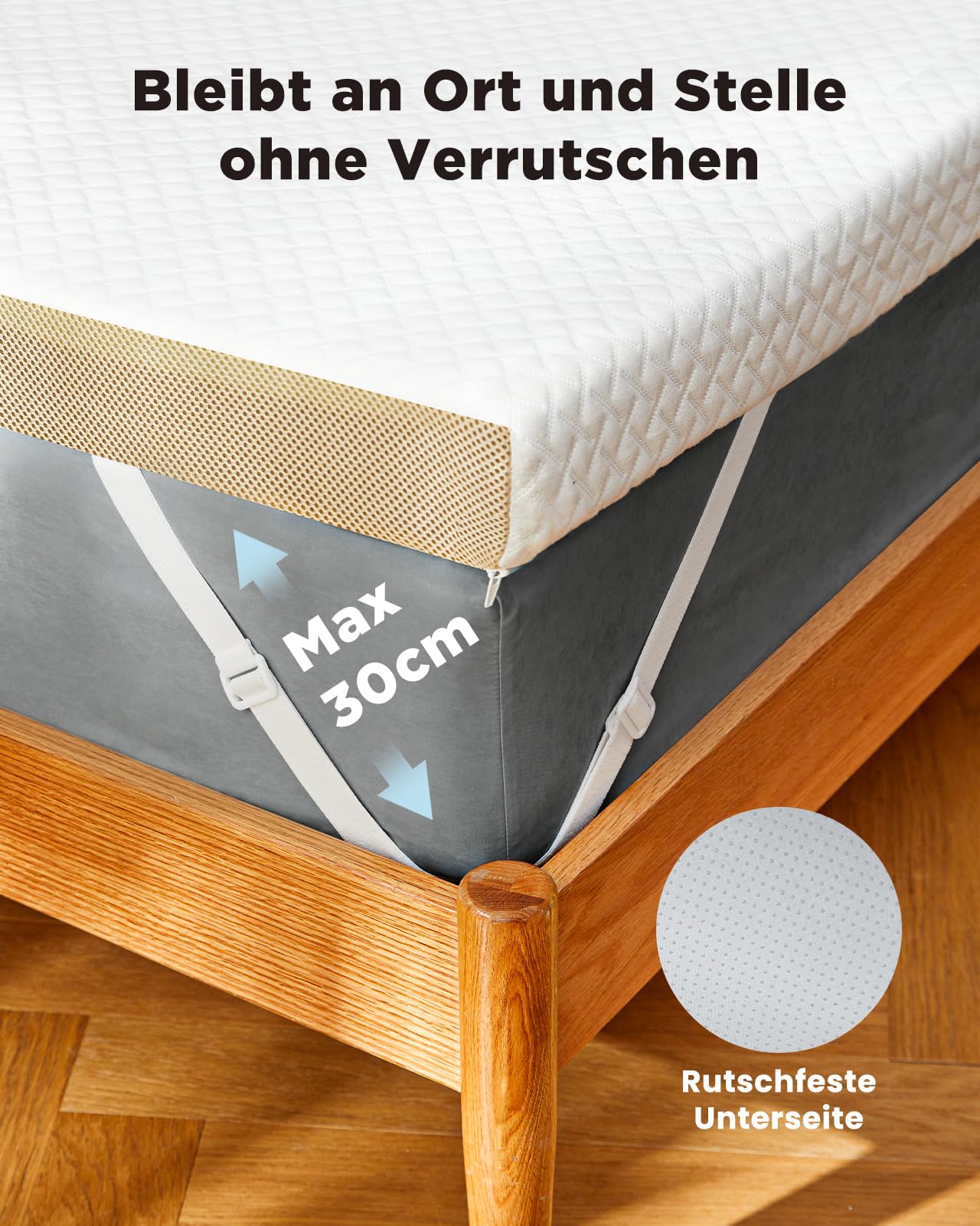 - Sicherer Halt ohne Verrutschen: Eine rutschfeste Unterseite und vier robuste Gummibänder an den Ecken sorgen dafür, dass die Auflage sicher auf Ihrer Matratze fixiert bleibt und nicht verrutscht.