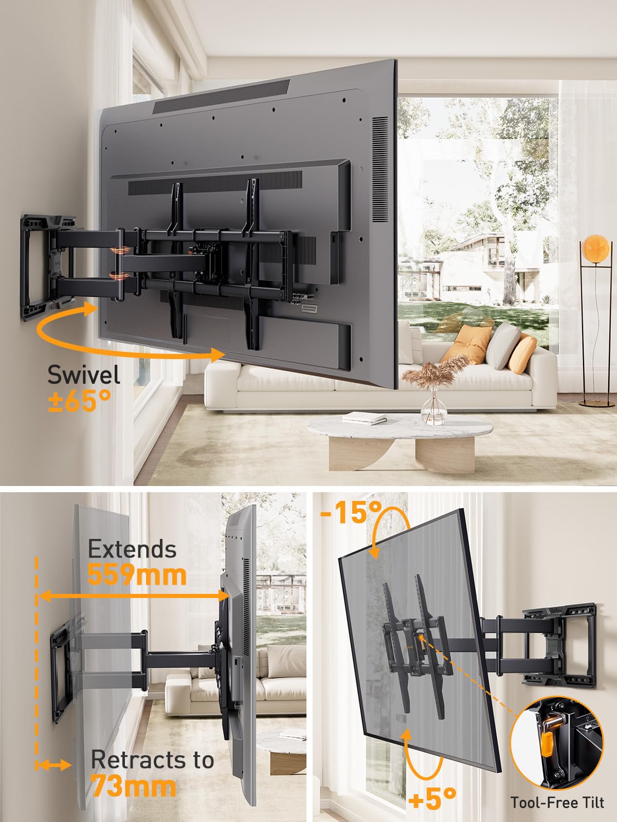 Sehr flexibel. Sie können den Fernseher um +/- 65° schwenken, bis zu 559 mm von der Wand ausziehen und werkzeugfrei von +5° bis -15° neigen, um störende Lichtreflexionen von Fenstern oder Lampen effektiv zu eliminieren.