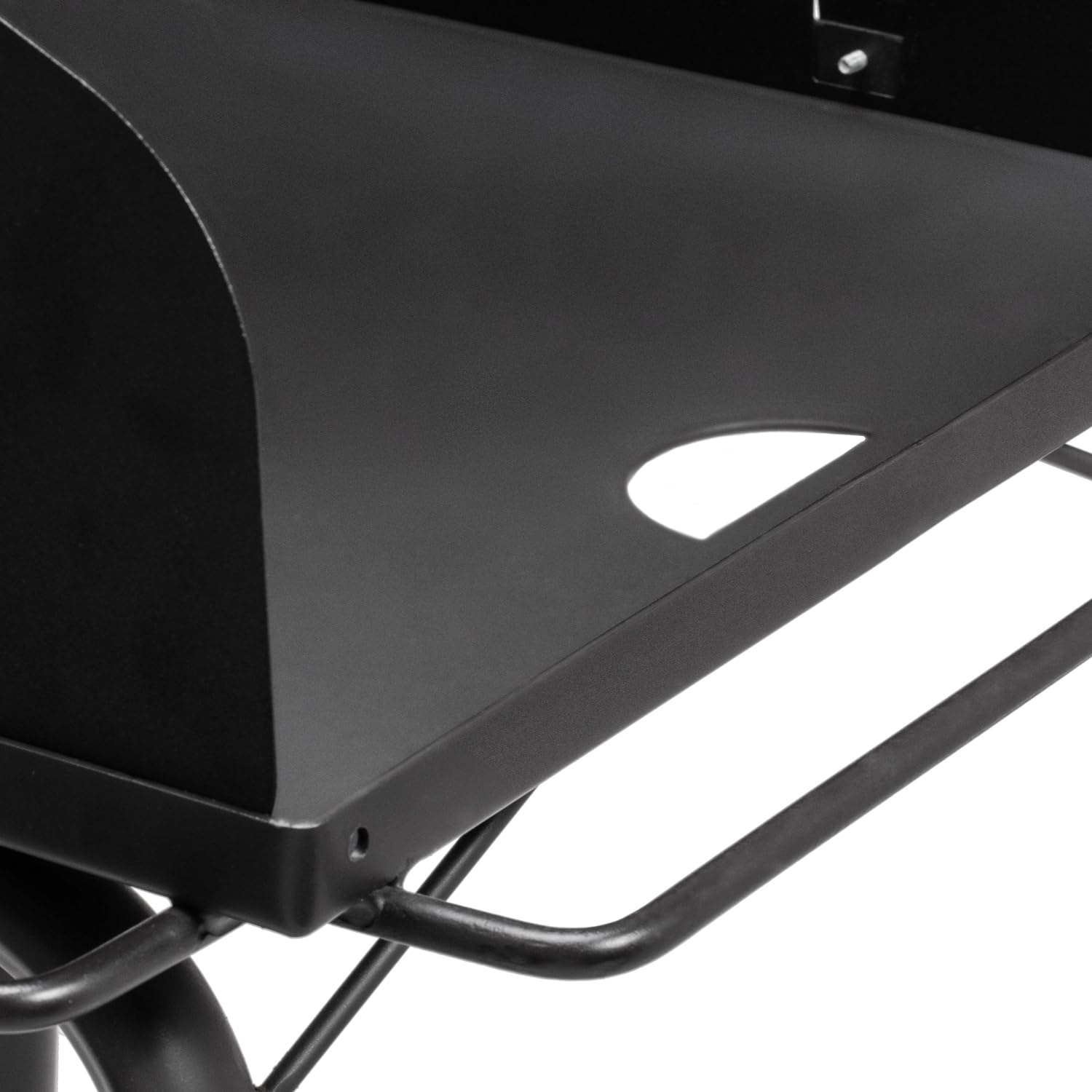 - Durchdachte Halterungen: Seitliche Bügel halten Kohlenzange, Grillhandschuhe und Geschirrtuch stets griffbereit.