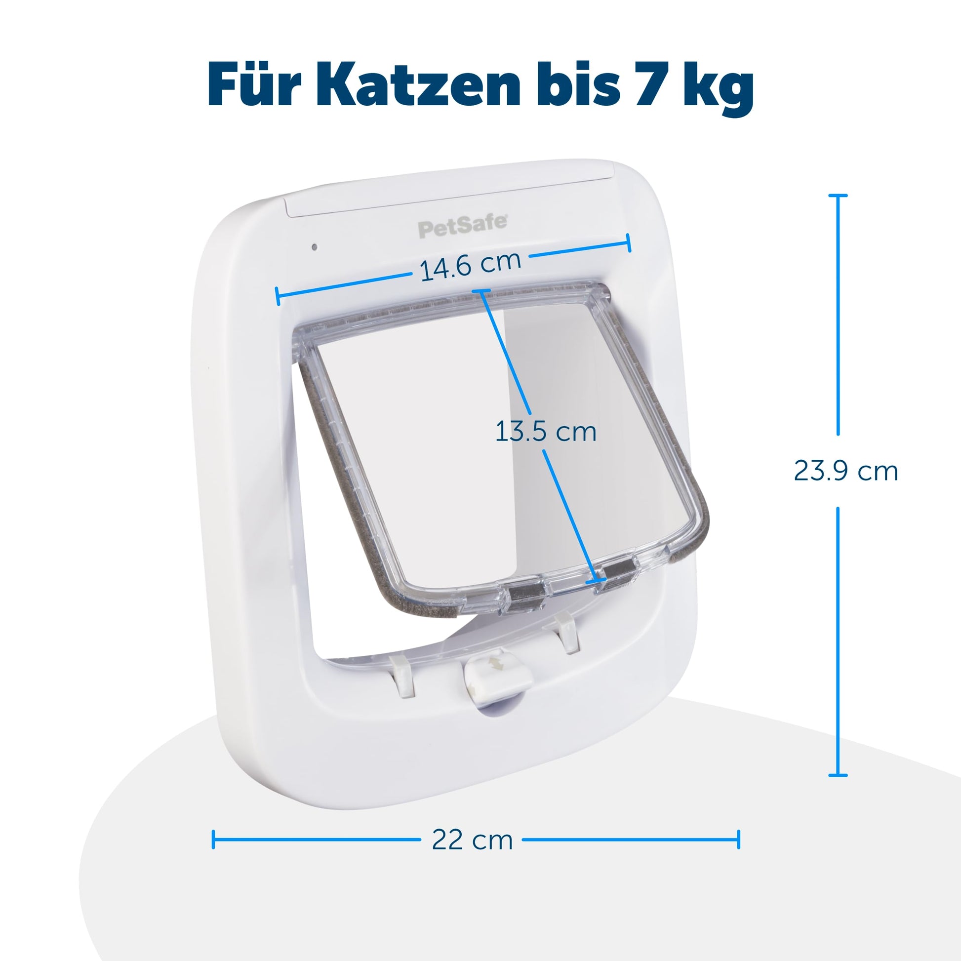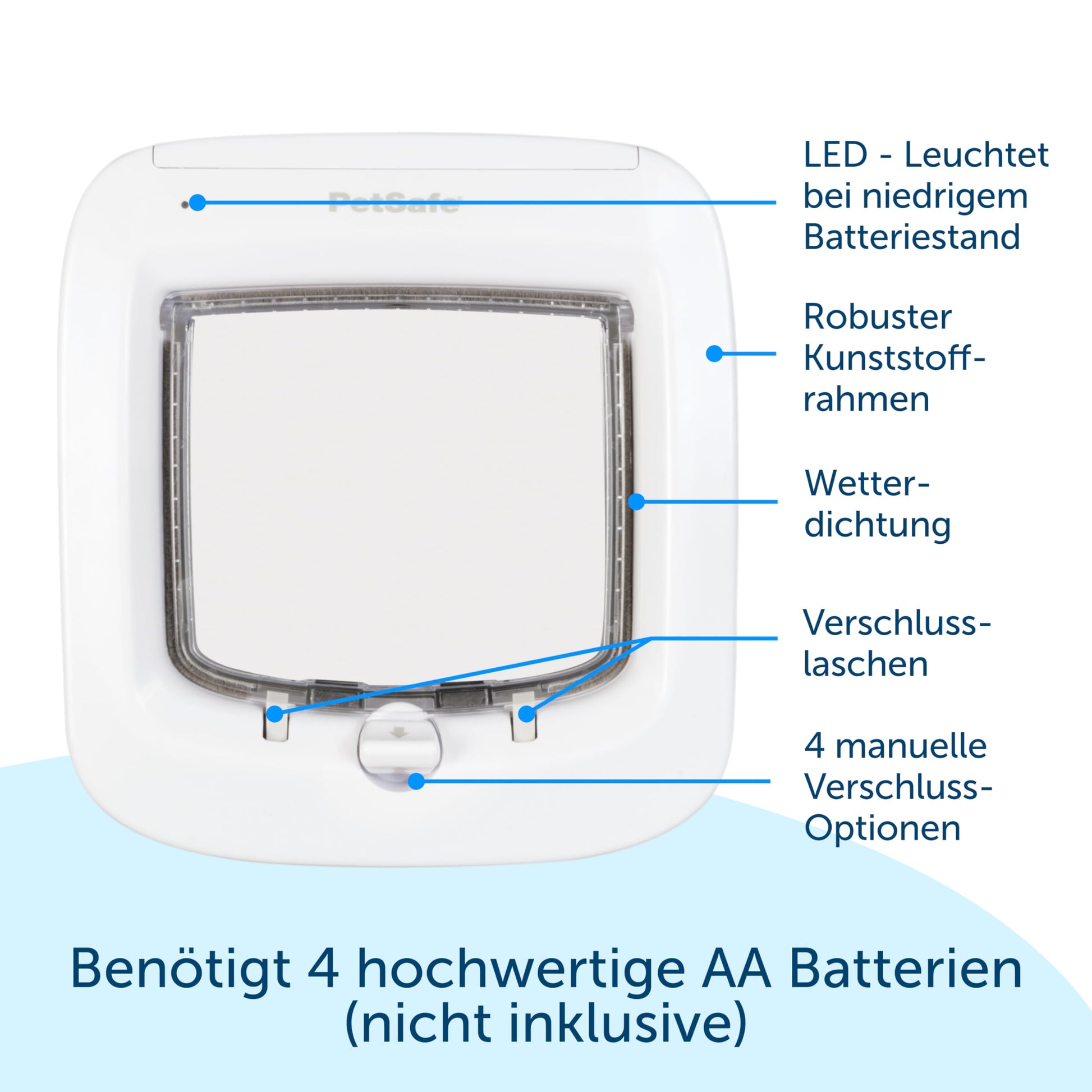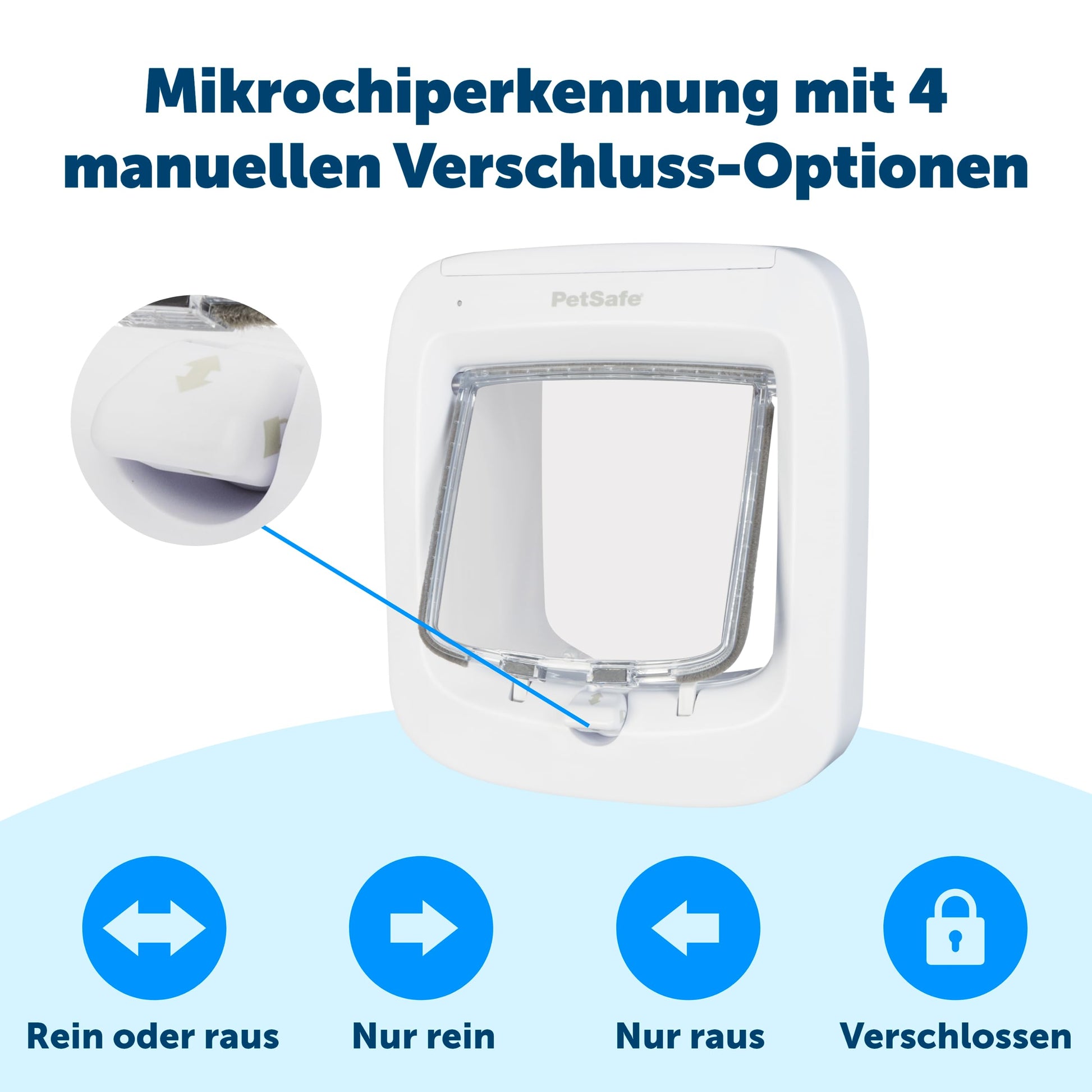 - Manueller 4-Wege-Verschluss: Bestimmen Sie selbst über den Zugang. Wählen Sie zwischen «nur rein», «nur raus», «komplett offen» oder «komplett geschlossen», um Ihre Katze bei Bedarf im Haus zu halten.