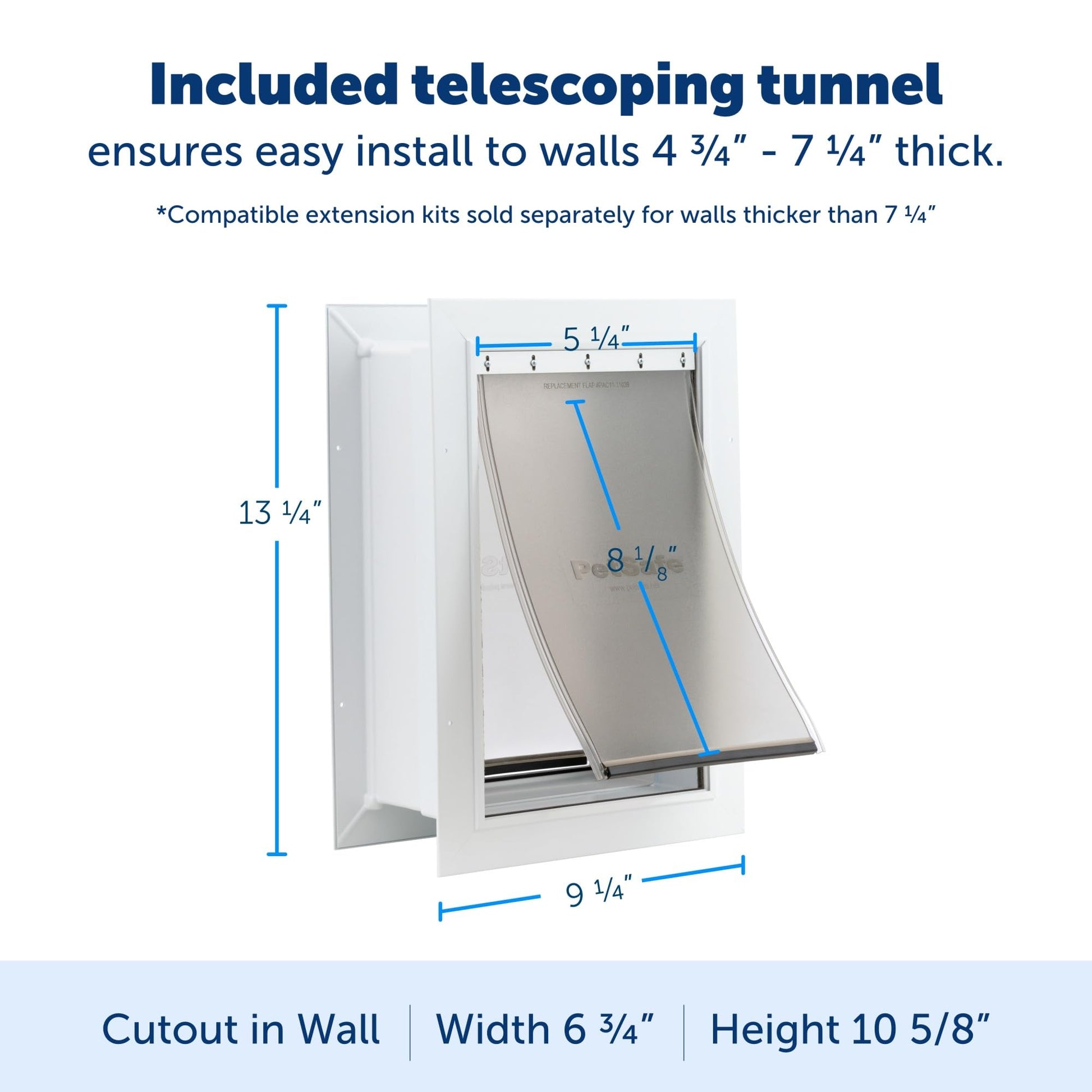 Diese Tür ist speziell für kleine Hunde und Katzen mit einem Körpergewicht von bis zu 7 kg konzipiert. Die Öffnung der Klappe misst 14 cm in der Breite und 21,6 cm in der Höhe, was Ihrem Liebling bequemen Durchgang ermöglicht.