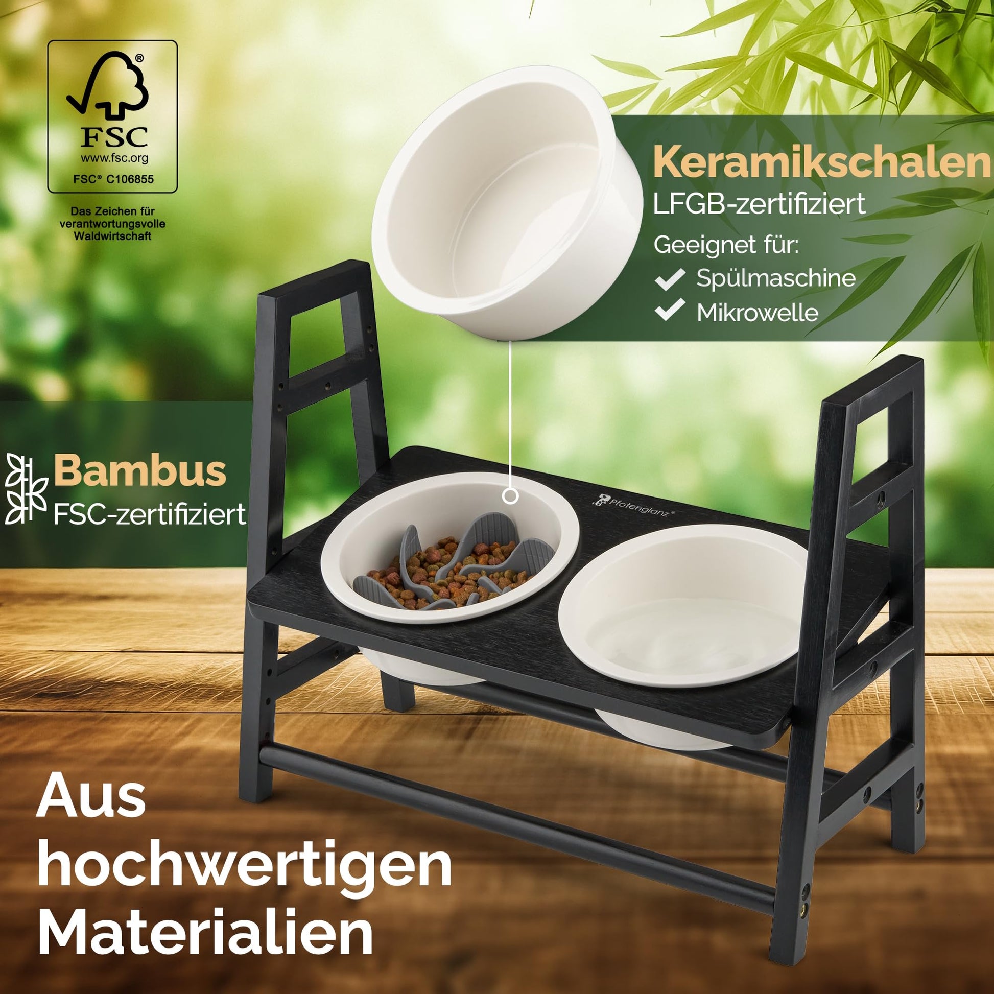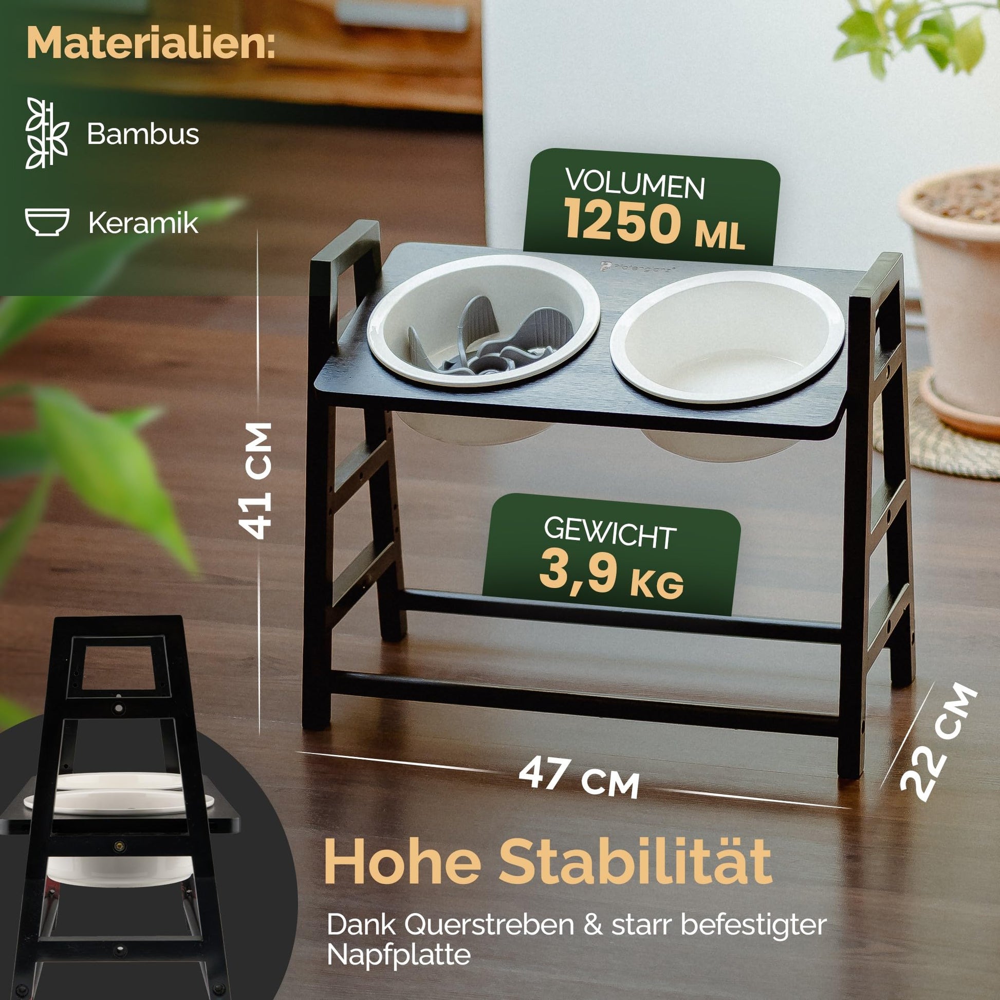 Die Kombination aus edlem Bambusholz und eleganten Keramiknäpfen fügt sich stilvoll in jedes Wohnambiente ein. Die pflegeleichten Materialien sind nicht nur hygienisch, sondern auch besonders langlebig und einfach zu reinigen.
