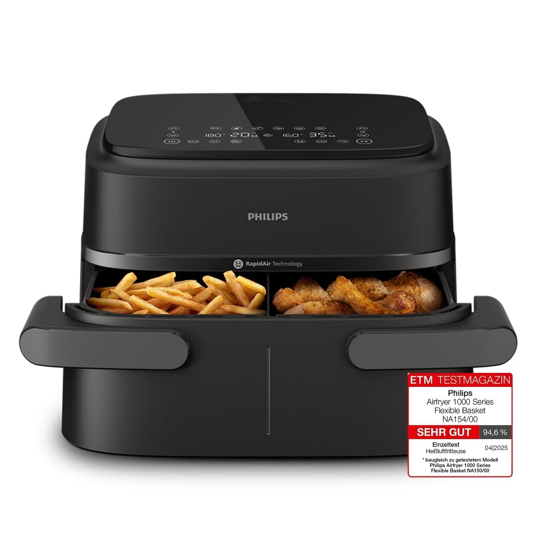 - Flexibler Garkorb mit Trennwand: Das grosszügige 7,1-Liter-Fassungsvermögen eignet sich perfekt für Familienportionen. Dank der praktischen Trennwand lässt sich der Korb in zwei 3,5-Liter-Zonen aufteilen, um zwei verschiedene Gerichte gleichzeitig zuzubereiten.