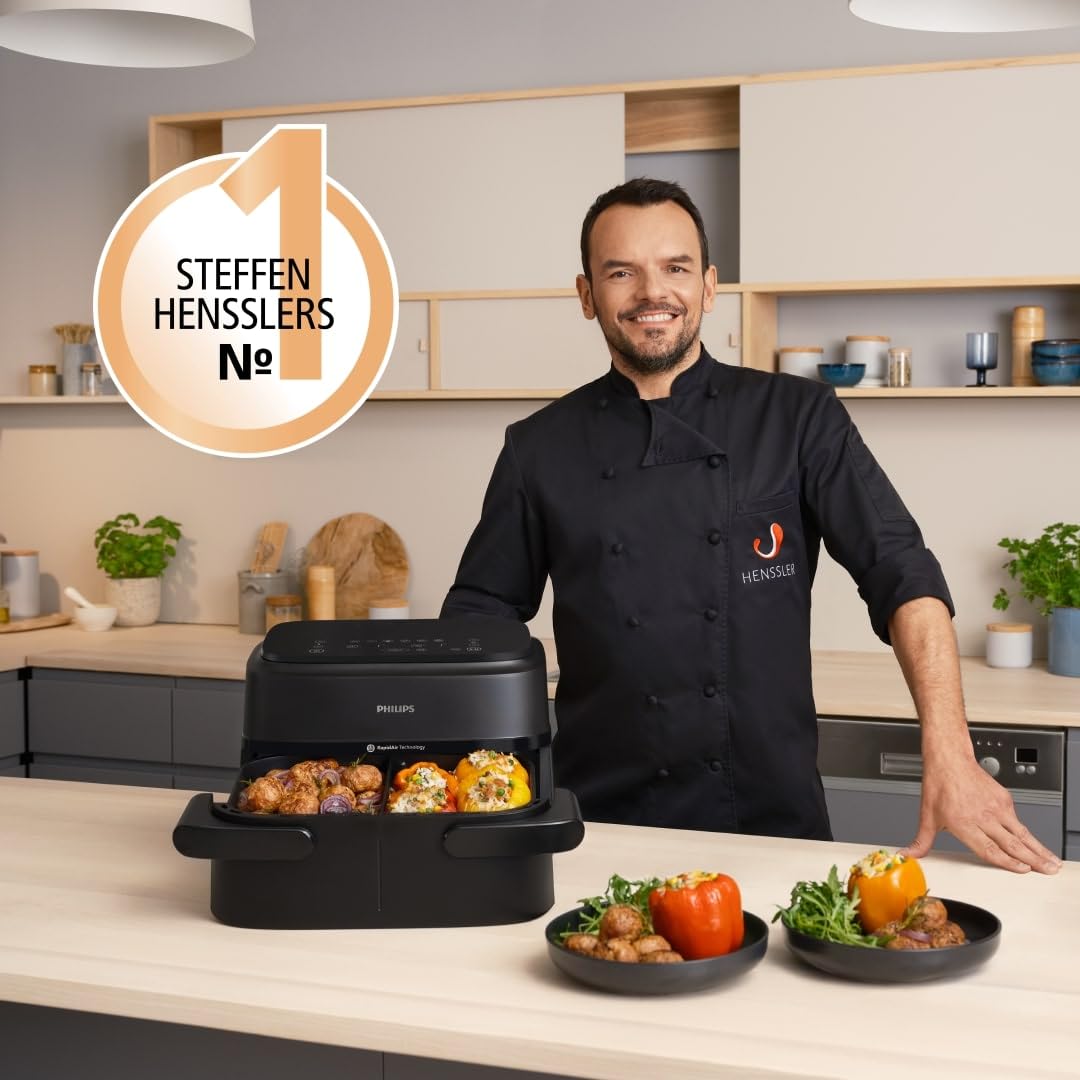 - RapidAir-Heisslufttechnologie: Erleben Sie perfekt knusprige Resultate, die aussen goldbraun und innen zart sind. Die innovative Technologie ermöglicht das Frittieren, Backen und Grillen mit bis zu 90 % weniger Fett.