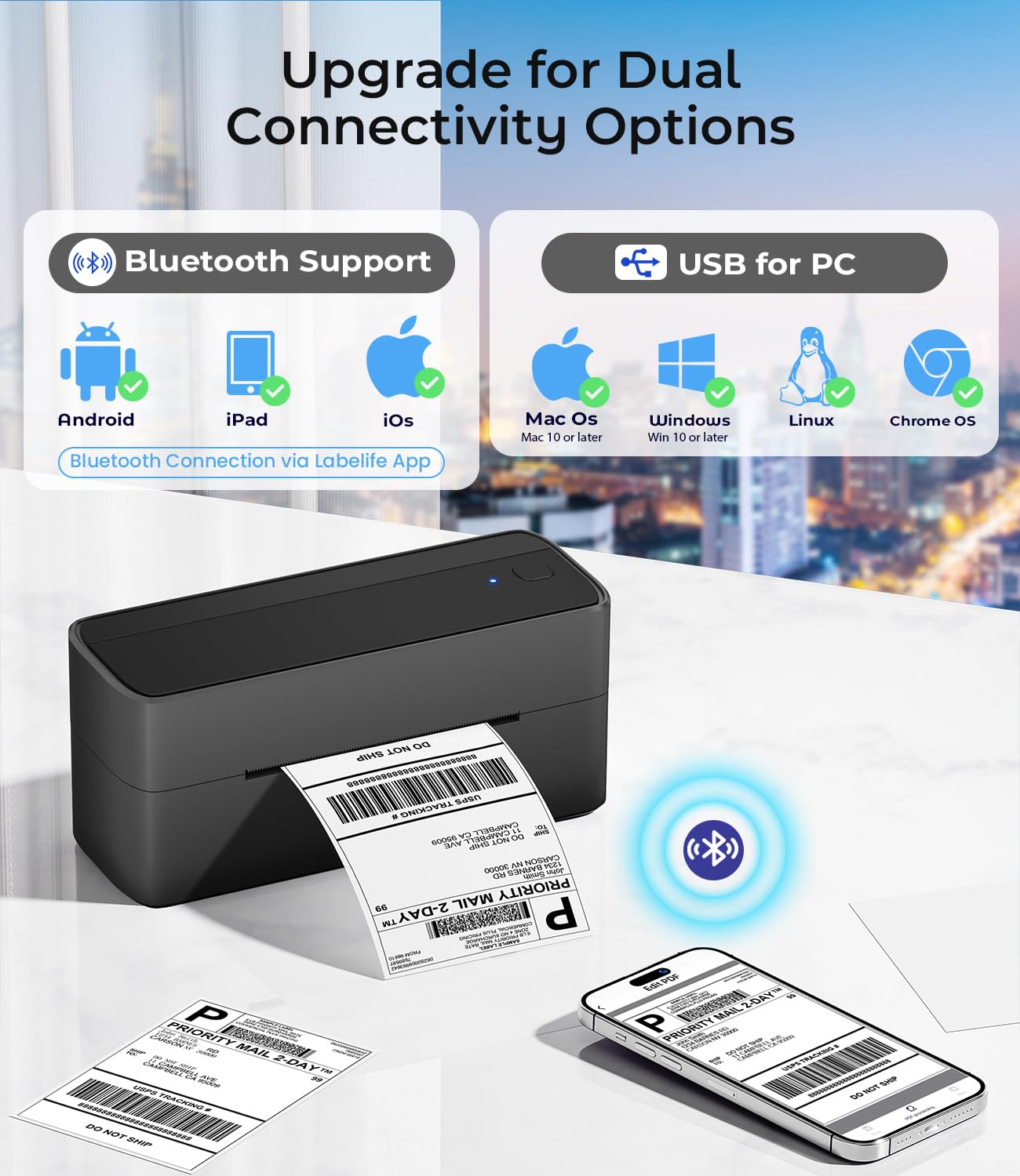- Flexible Verbindungsoptionen: Drucken Sie kabellos via Bluetooth direkt von Ihrem Smartphone oder Tablet (über die «Labelife»-App). Alternativ lässt sich der Drucker auch klassisch per USB-Kabel mit Ihrem PC, Mac, Linux- oder ChromeOS-Computer verbinden.