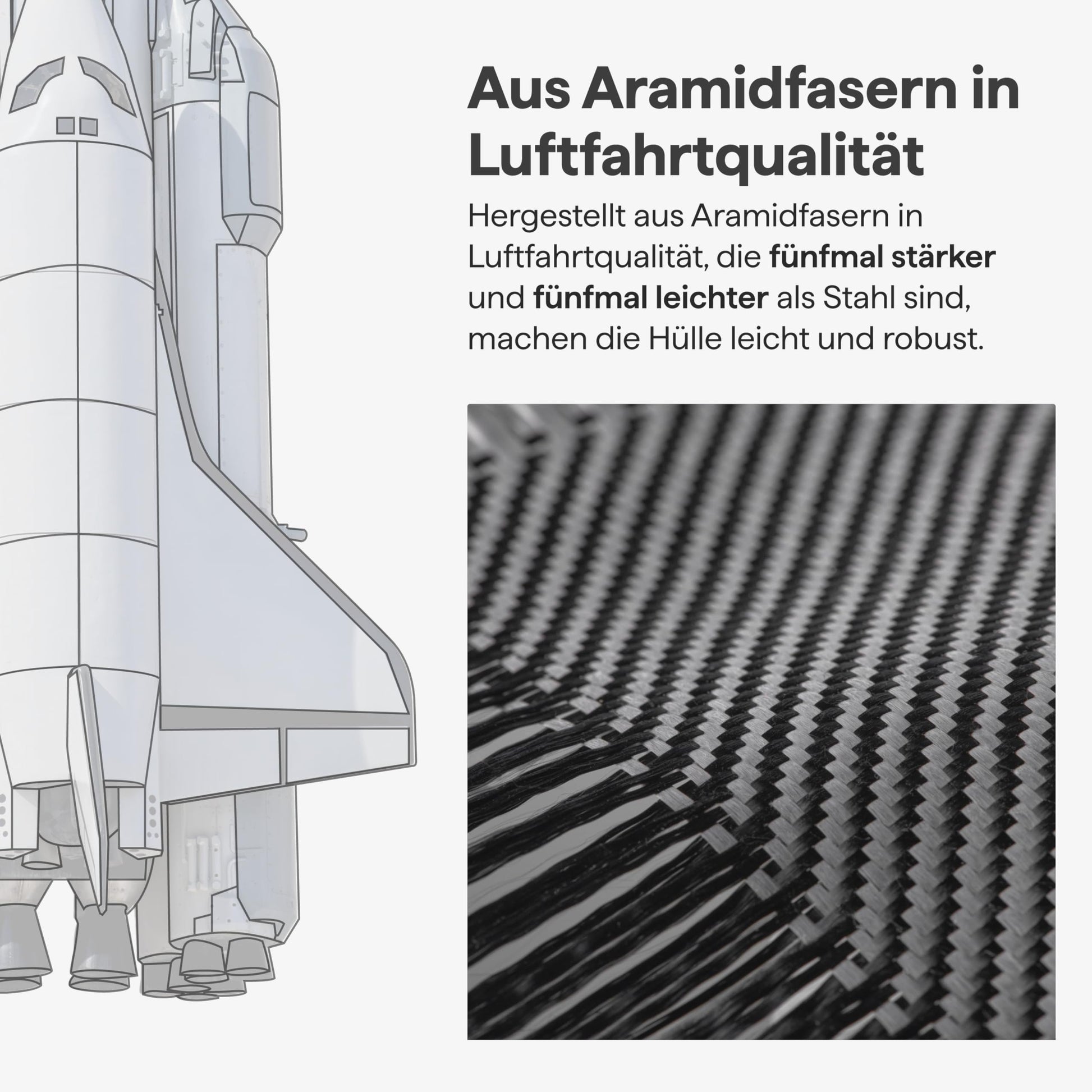 - Material aus Aramidfaser: Gefertigt aus Fasern in Luftfahrtqualität, die für ihre aussergewöhnliche Robustheit und ihr geringes Gewicht bekannt sind.