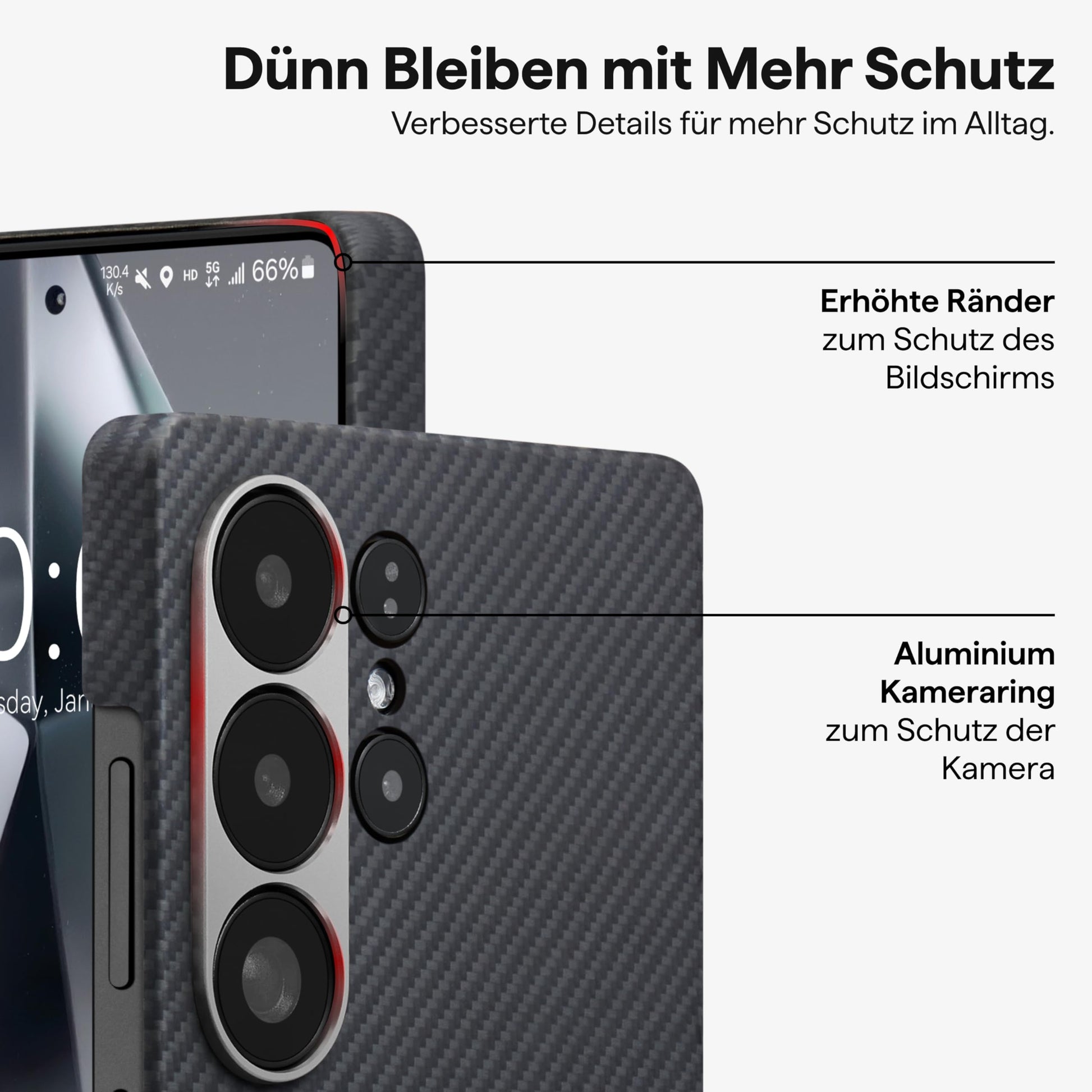 Die Hülle ist aus Aramidfaser in Luftfahrtqualität gefertigt. Dieses Material ist bekannt dafür, fünfmal stärker als Stahl zu sein, aber dabei deutlich leichter. Dadurch bietet die Hülle extremen Schutz, ohne Ihr Samsung Galaxy S25 Ultra klobig oder schwer zu machen.