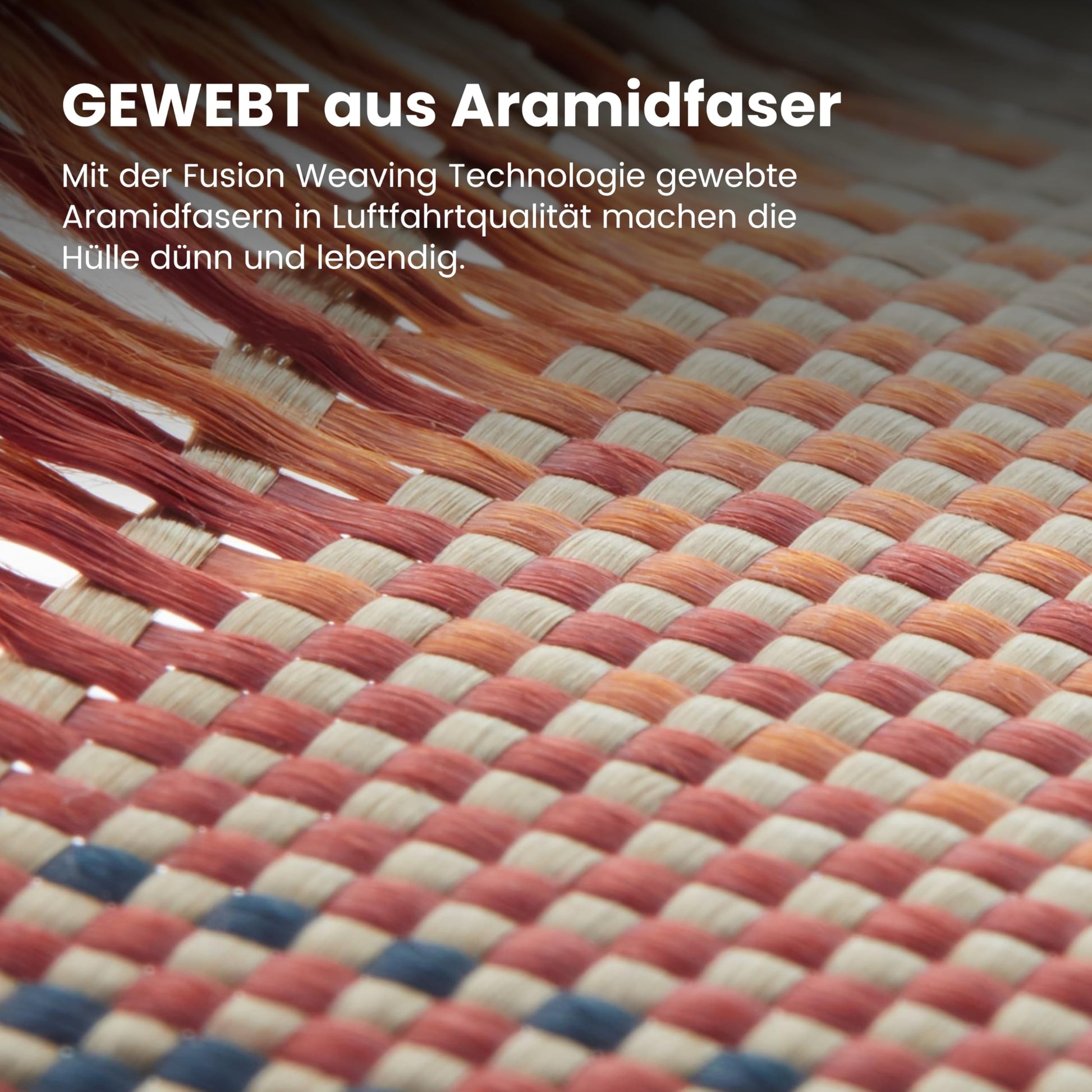 Die Hülle besteht aus 100% Aramidfasern in Luftfahrtqualität. Dieses Hightech-Material ist laut Hersteller fünfmal stärker als Stahl, aber gleichzeitig federleicht, und schützt Ihr iPhone 16 Pro zuverlässig vor Kratzern und alltäglichen Stössen, ohne es zu beschweren.