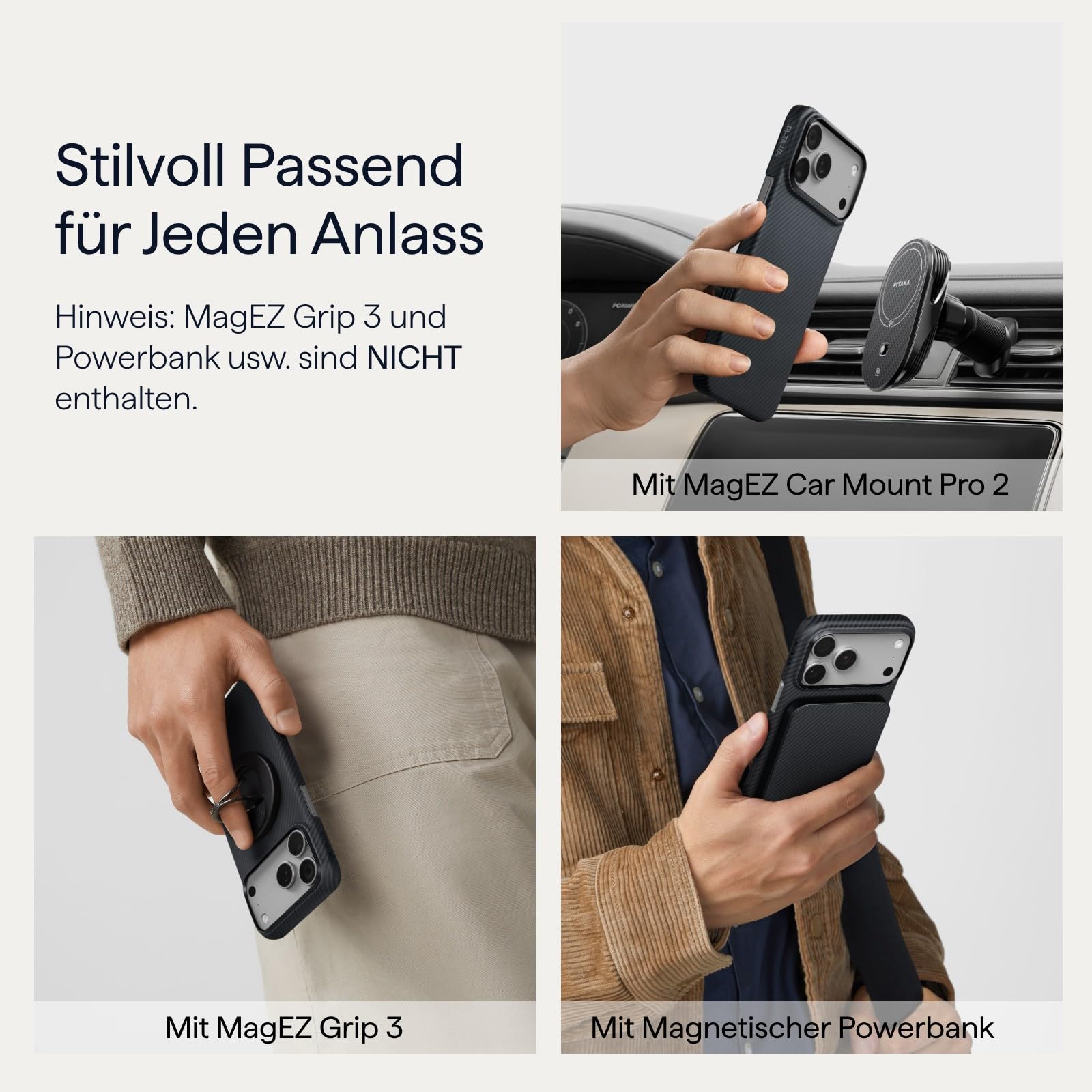 - Volle Magsafe-Kompatibilität: Starke, integrierte N52SH-Magnete garantieren eine zuverlässige Verbindung mit Magsafe-Zubehör wie Ladegeräten, Halterungen (z.B. PITAKA MagEZ Car Mount Pro 2) oder Griffen (z.B. PITAKA MagEZ Grip 3).