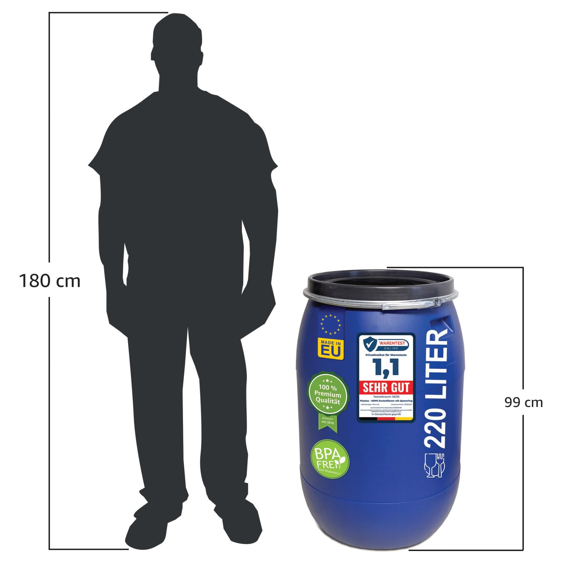 - Lieferumfang: 1x 220 Liter Fass in Blau, inklusive Deckel und Spannring.