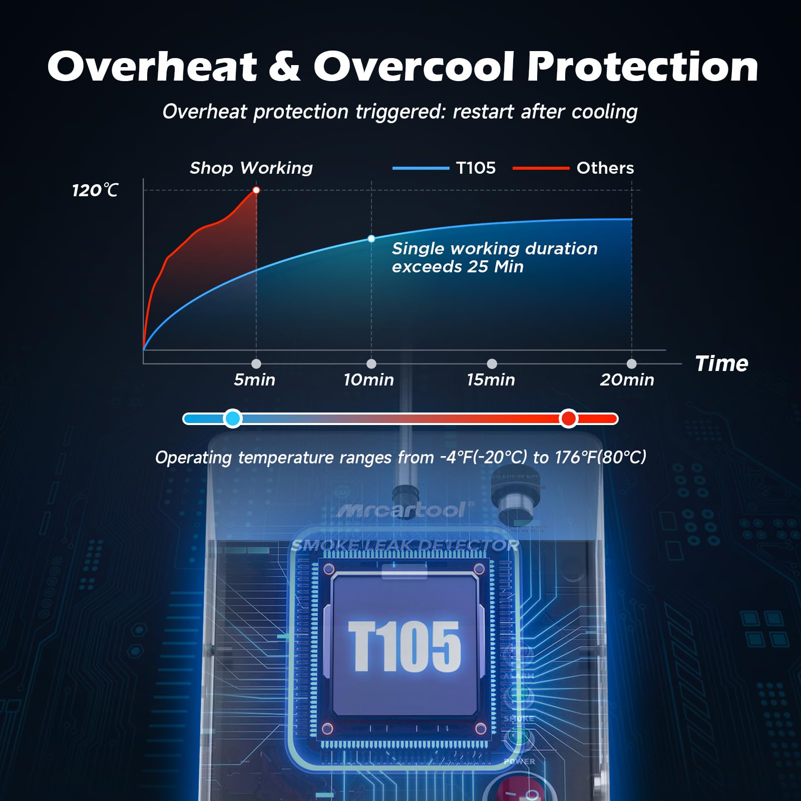 Für maximale Betriebssicherheit ist der T105 mit einem intelligenten Schutzmechanismus ausgestattet, der das Gerät bei Temperaturen über 75 °C automatisch abschaltet, um Überhitzung zu vermeiden. Dies schützt sowohl den Anwender als auch das Gerät. Zusätzlich profitieren Sie von einer umfassenden 3-jährigen Garantie für eine sorgenfreie Nutzung.