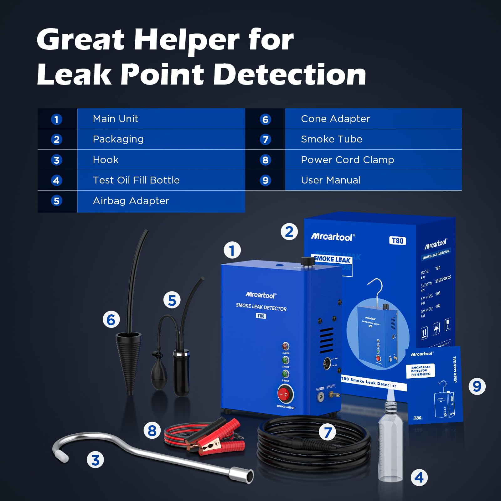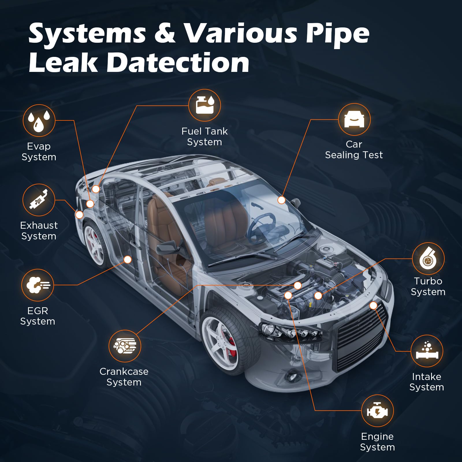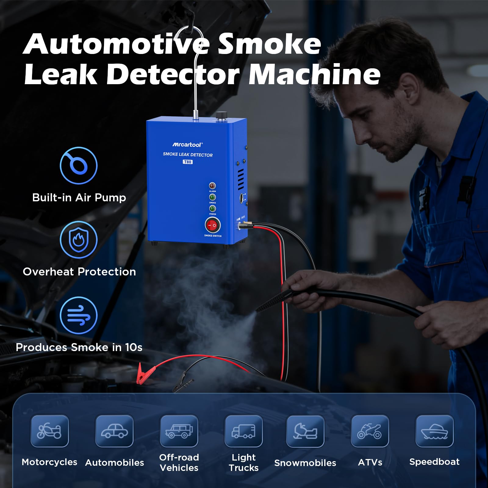 Das T80 ist ideal zur Diagnose von Undichtigkeiten in verschiedensten Systemen. Dazu gehören das Ansaugsystem, die Abgasanlage, das EVAP-System (Kraftstoffdampf-Rückführung), der Kraftstofftank sowie allgemeine Fahrzeugdichtungen. Dank des Universal-Adapters eignet es sich für Pkw, Motorräder, Kleinlaster und sogar Boote.