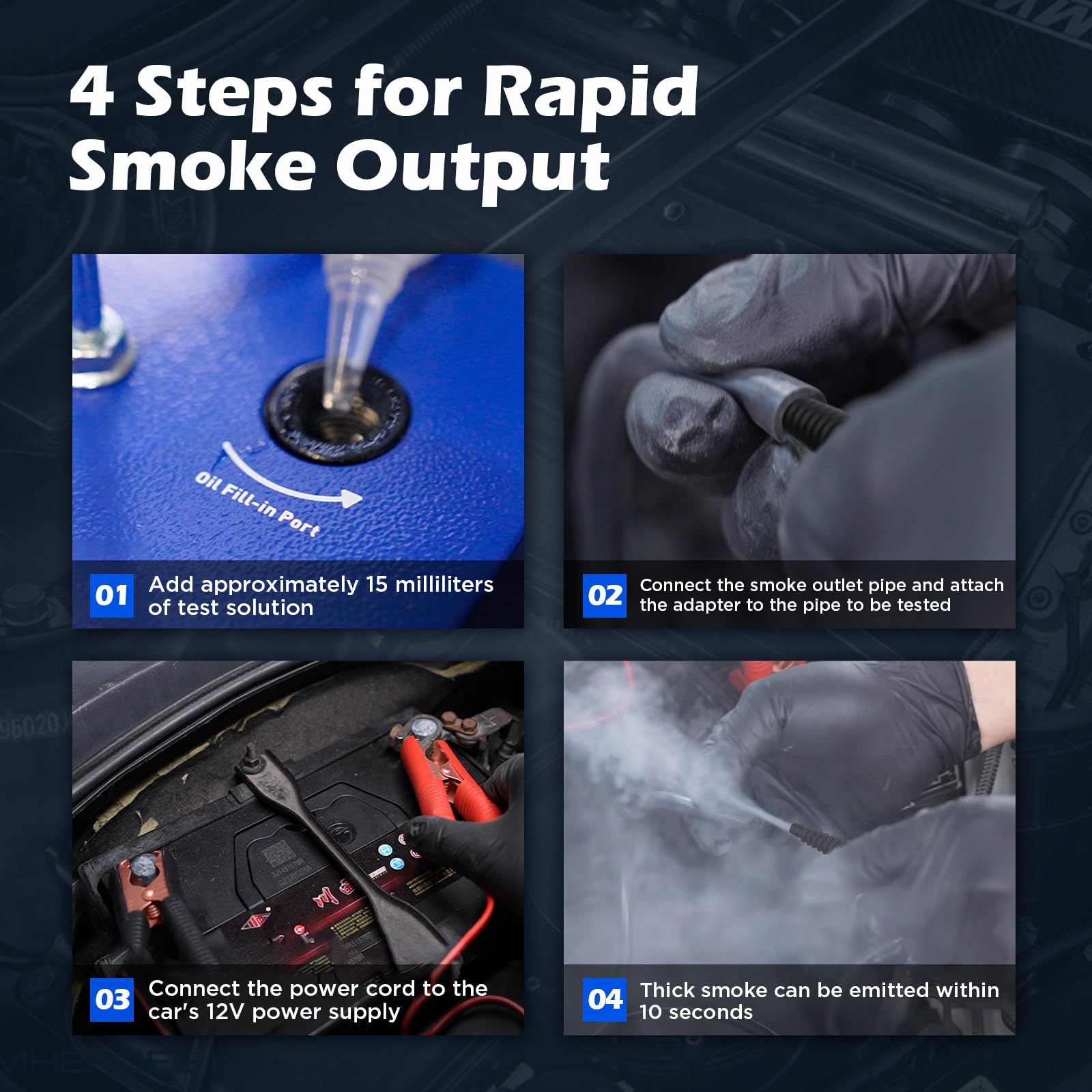 Das Gerät ist extrem schnell. Bereits 10 Sekunden nach dem Einschalten erzeugt es dichten, weissen Rauch, der selbst kleinste Undichtigkeiten sofort klar und deutlich sichtbar macht. So können Sie ohne lange Wartezeit effizient mit der Diagnose beginnen.