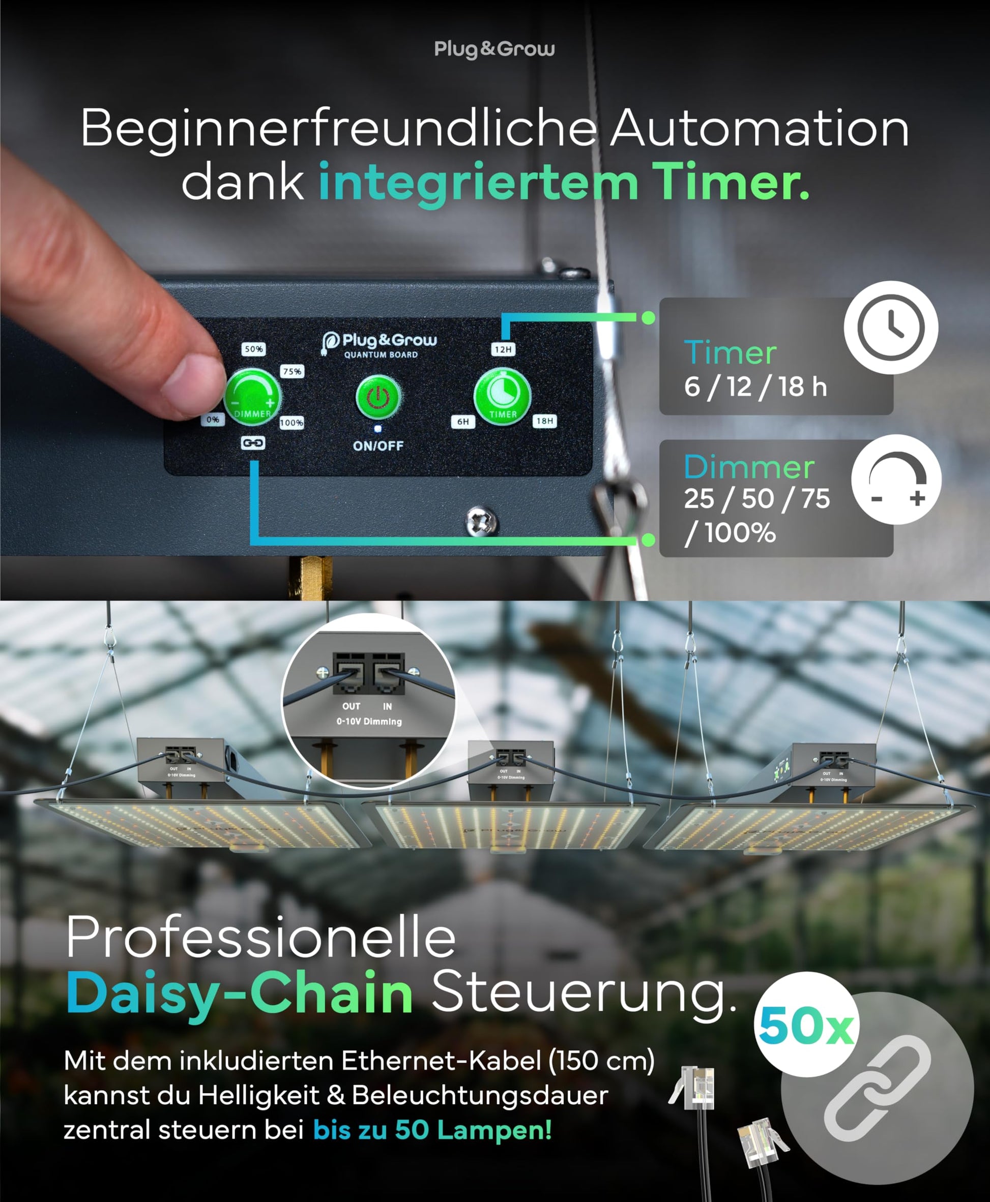 - Erweiterbare Daisy-Chain-Funktion: Verbinden und steuern Sie bis zu 50 Lampen zentral über ein einziges mitgeliefertes 150 cm Ethernet-Kabel – ideal für grössere Anbauflächen oder hydroponische Systeme.