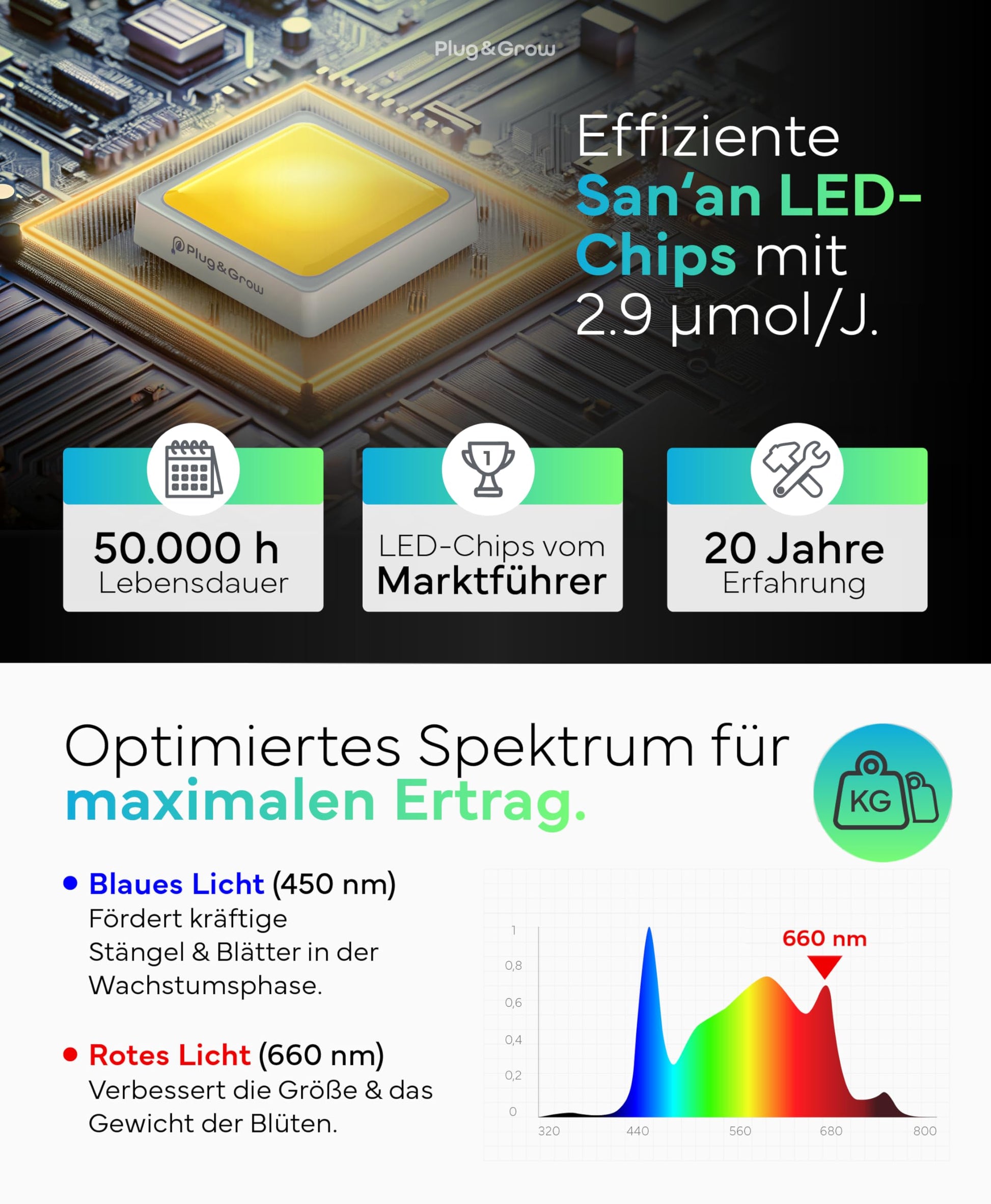 Ermöglichen Sie maximale Erträge von bis zu 200 g pro Pflanze. Das Vollspektrum-Licht mit gezielten Spitzen im blauen (450 nm) und roten (660 nm) Bereich fördert ein kräftiges Wachstum und eine üppige Blütenbildung.