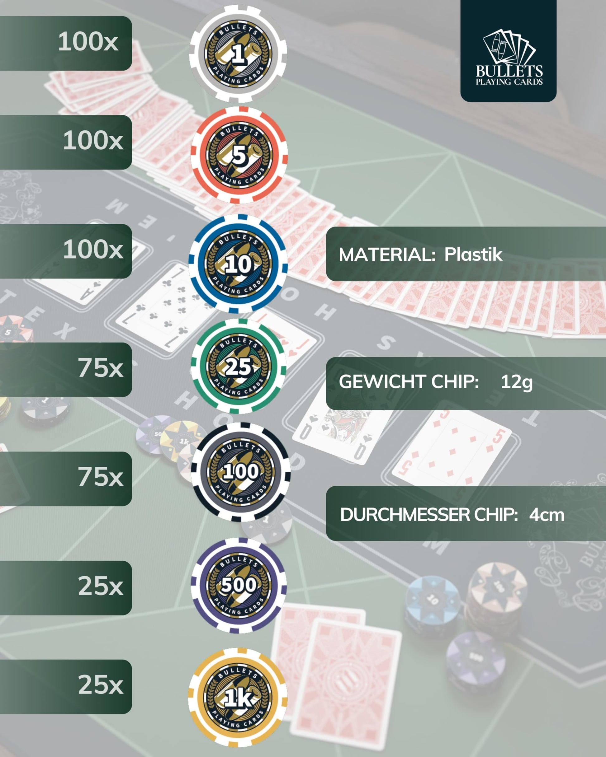 Mit 500 Chips ist dieses Set ideal für Spielrunden mit 6 bis 10 Spielern geeignet. Die durchdachte Verteilung der Chip-Werte von 1 bis 1000 sorgt für einen dynamischen und ausgeglichenen Spielverlauf, egal ob bei kleinen Runden oder grösseren Turnieren zu Hause.