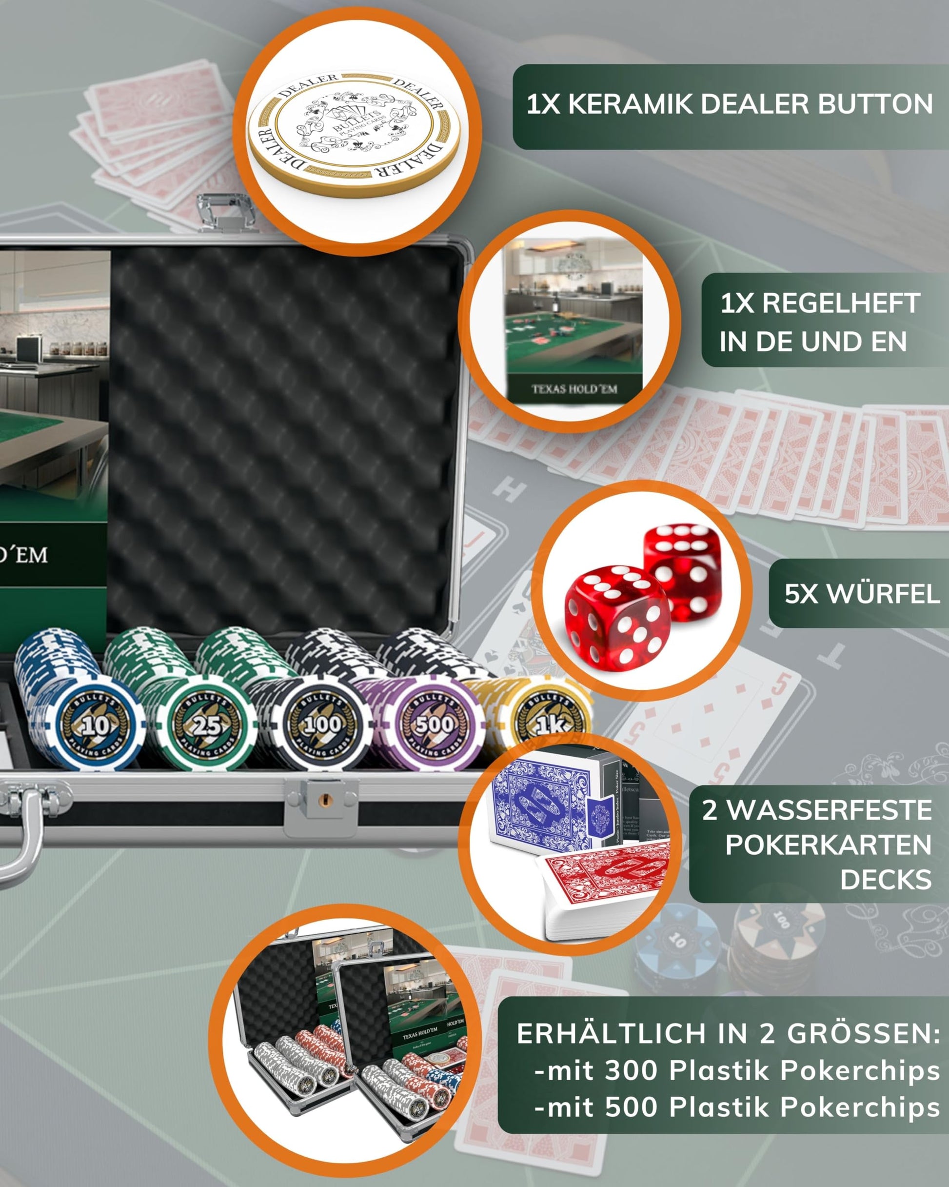 Das Set wird in einem robusten Designerkoffer geliefert und enthält alles, was Sie für einen sofortigen Start benötigen: 500 griffige Pokerchips, zwei Decks langlebiger Plastik-Spielkarten (je 54 Karten), fünf Würfel, einen hochwertigen Keramik Dealer Button sowie eine Anleitung für Texas Holdem.