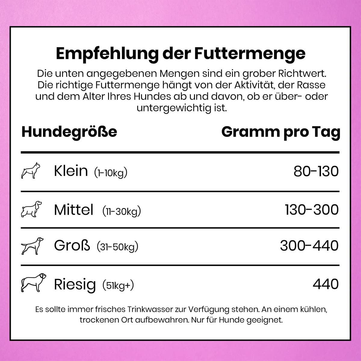 Die nachfolgenden Angaben sind als Richtwerte zu verstehen. Die optimale Futtermenge variiert je nach Aktivität, Rasse, Alter und Gewicht Ihres Hundes. Stellen Sie sicher, dass stets frisches Trinkwasser bereitsteht.