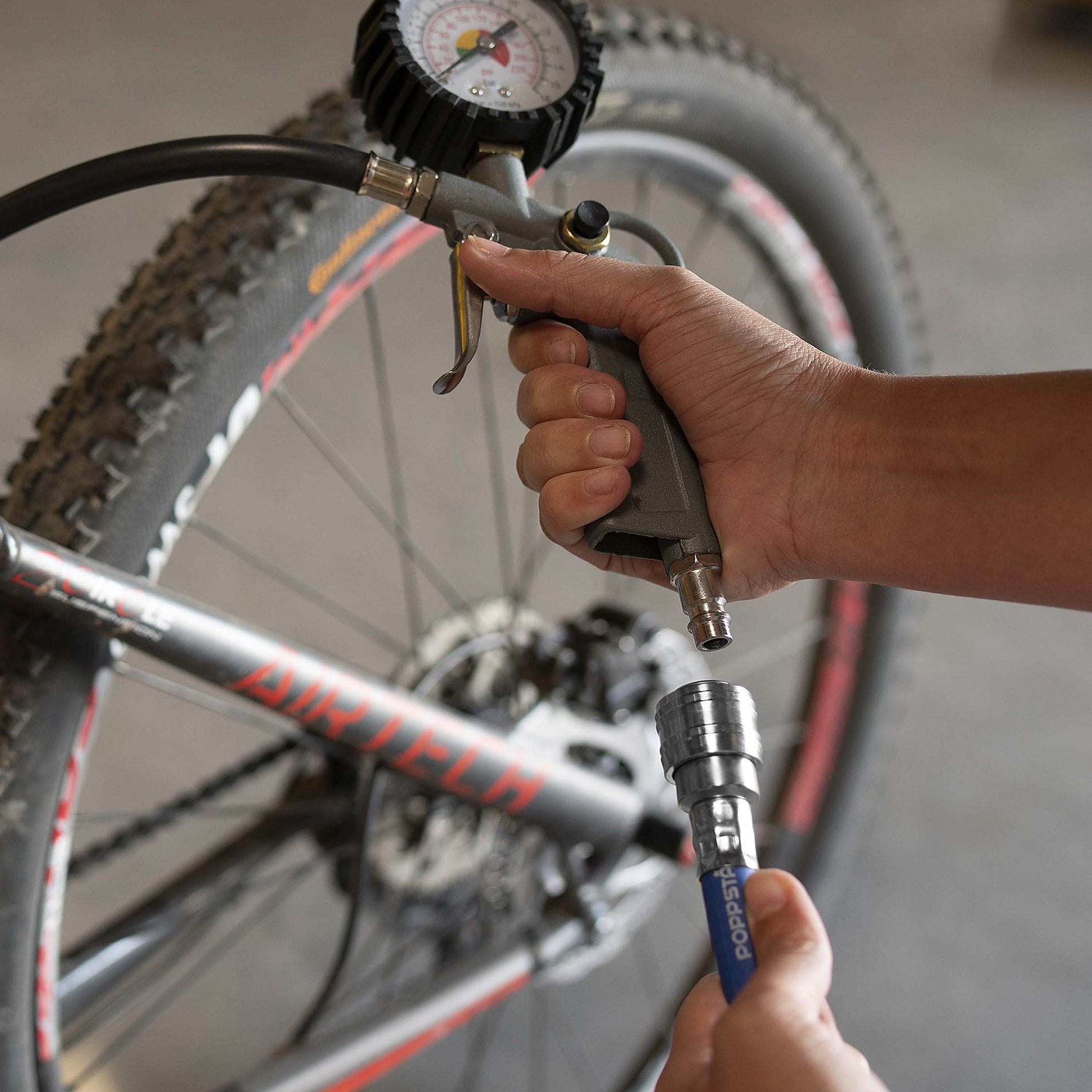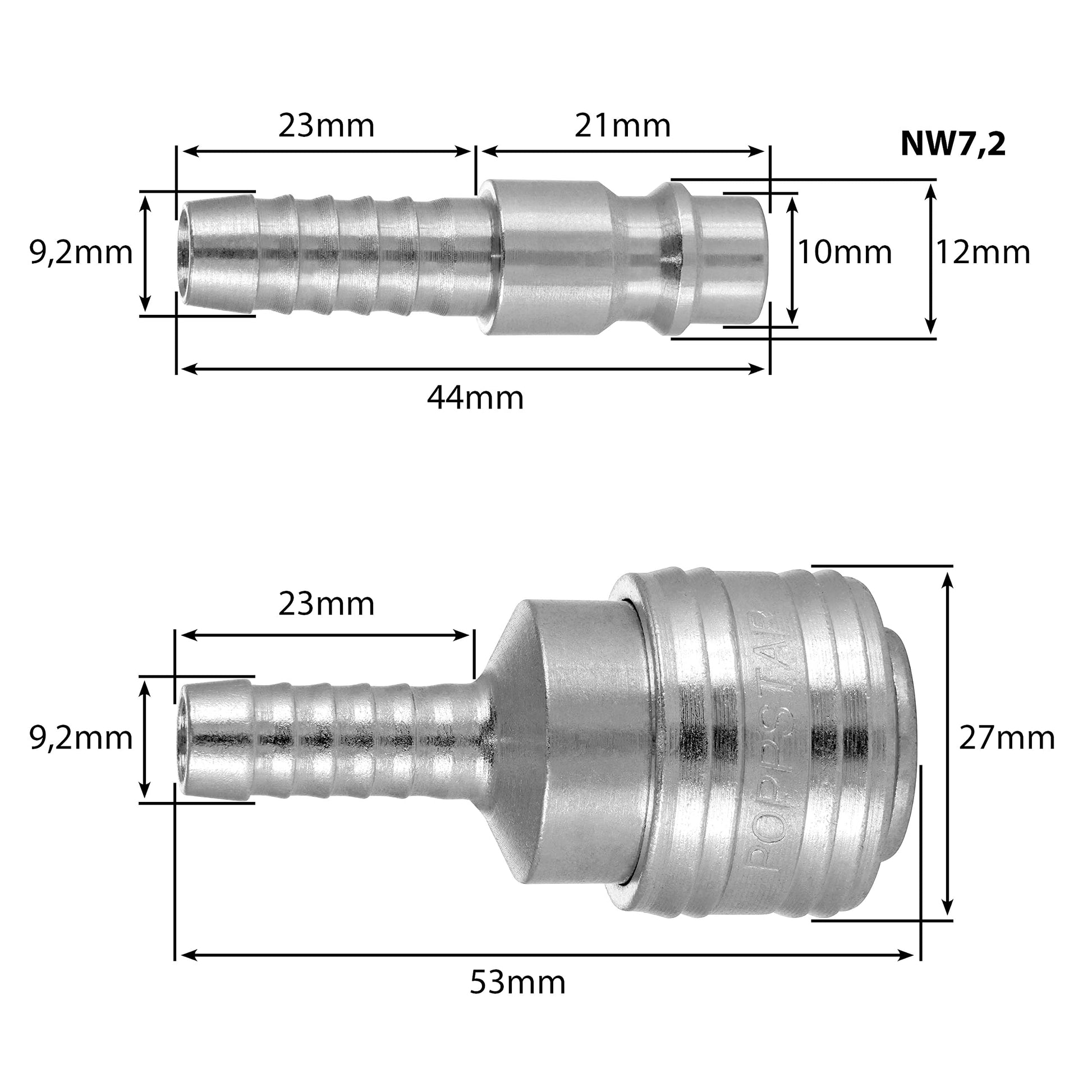 Die universellen Anschlüsse aus robustem, vernickeltem Edelstahl sind nicht nur äusserst langlebig, sondern garantieren auch eine breite Kompatibilität mit den meisten gängigen Kompressoren und Druckluftgeräten.