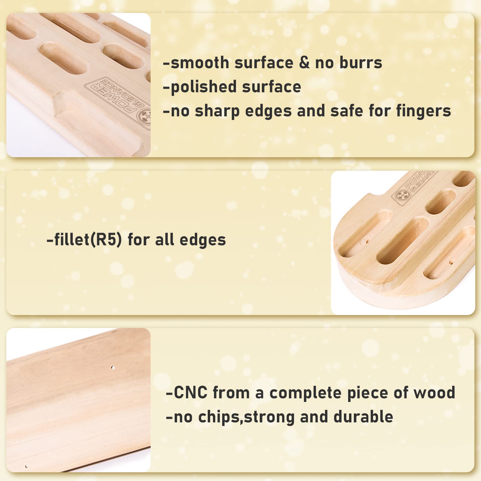 Das Trainingsboard ist aus robustem, hautfreundlichem Holz gefertigt, das einen natürlichen und sicheren Griff bietet. Mit dem mitgelieferten Schleifpapier können Sie die Oberfläche der Griffe bei Bedarf leicht anrauen und die Griffigkeit individuell nach Ihren Wünschen anpassen.