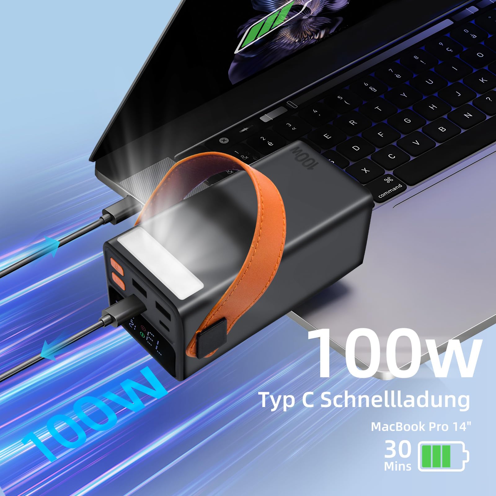 Ja, absolut. Dank des leistungsstarken 100W Power Delivery (PD) USB-C-Anschlusses ist diese Powerbank speziell dafür ausgelegt, auch anspruchsvolle Laptops wie MacBooks oder andere USB-C-Notebooks ultraschnell und effizient aufzuladen.