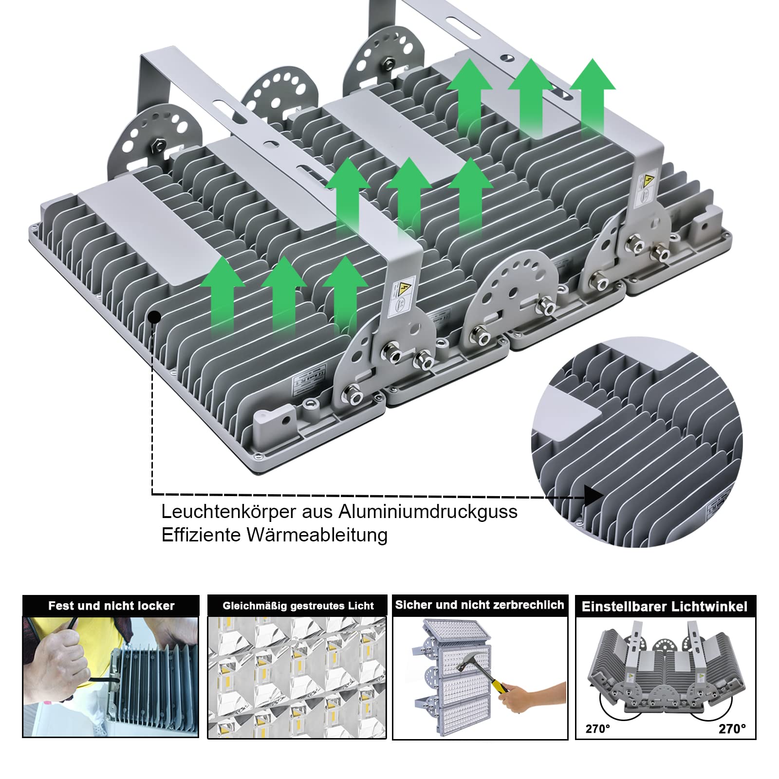 Dieser leistungsstarke 400W LED Flutlichtstrahler ist die ideale Lösung für die grossflächige Ausleuchtung von Aussenbereichen. Dank seiner modularen Bauweise und robusten Konstruktion bietet er herausragende Flexibilität und eine lange Lebensdauer.