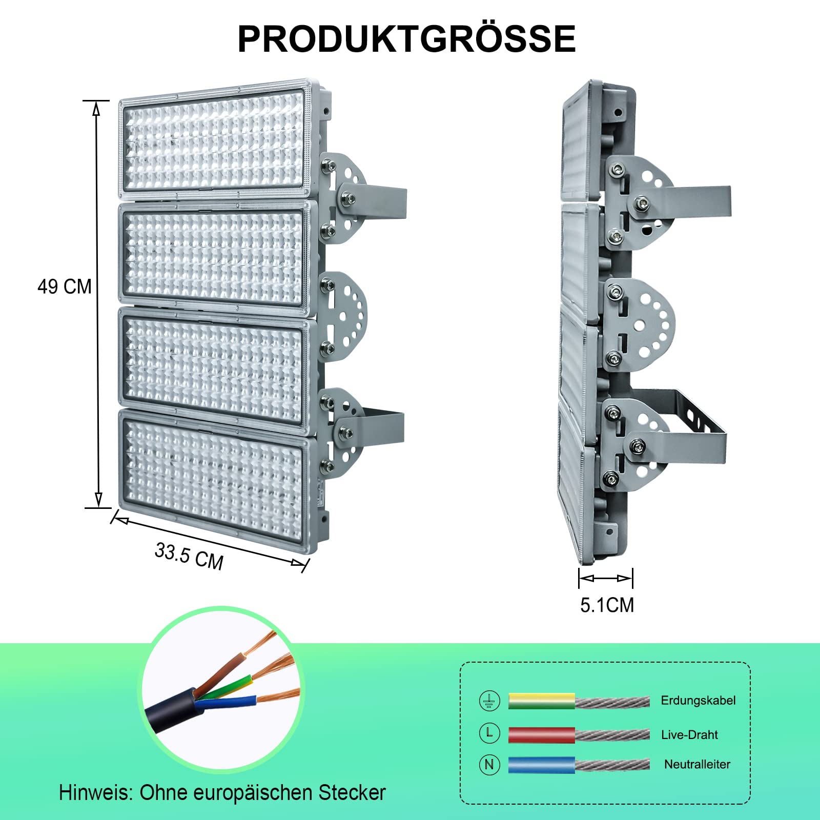- Extrem helle & gleichmässige Ausleuchtung: Mit einer Lichtleistung von 40'000 Lumen (100 lm/W) und einer optischen PC-Linse sorgt der Fluter für ein intensives, aber gleichmässiges Licht. Der integrierte Treiber verhindert Flimmern (Stroboskop-Effekt), was die Augen schont und für mehr Sicherheit sorgt.