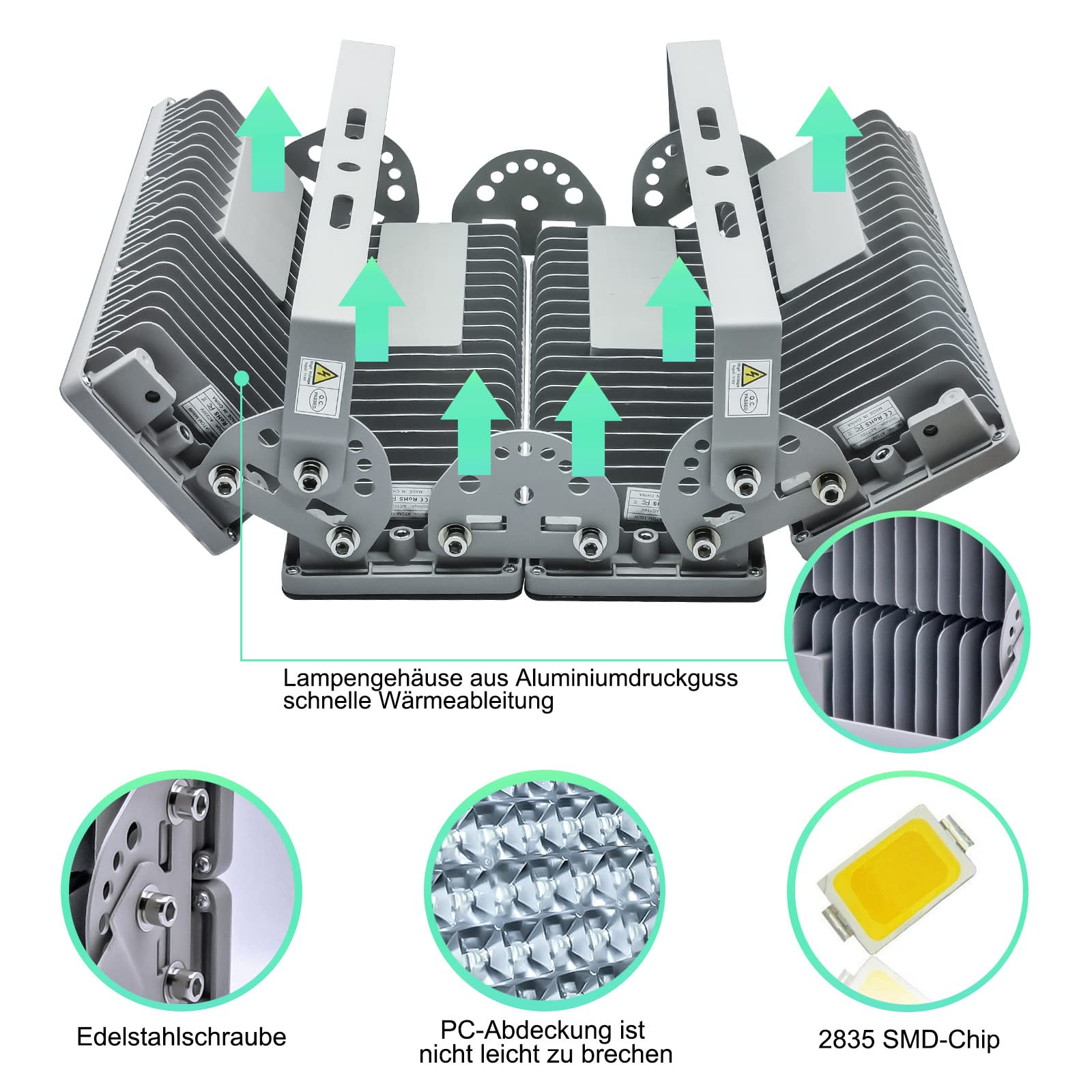 - Flexible Ausrichtung: Der Strahler besteht aus vier einzeln verstellbaren 100W-Modulen. Dank der dreieckigen Montagevorrichtung lässt sich der Beleuchtungswinkel jedes Moduls individuell anpassen, um eine maximale und passgenaue Ausleuchtungsfläche zu erzielen.