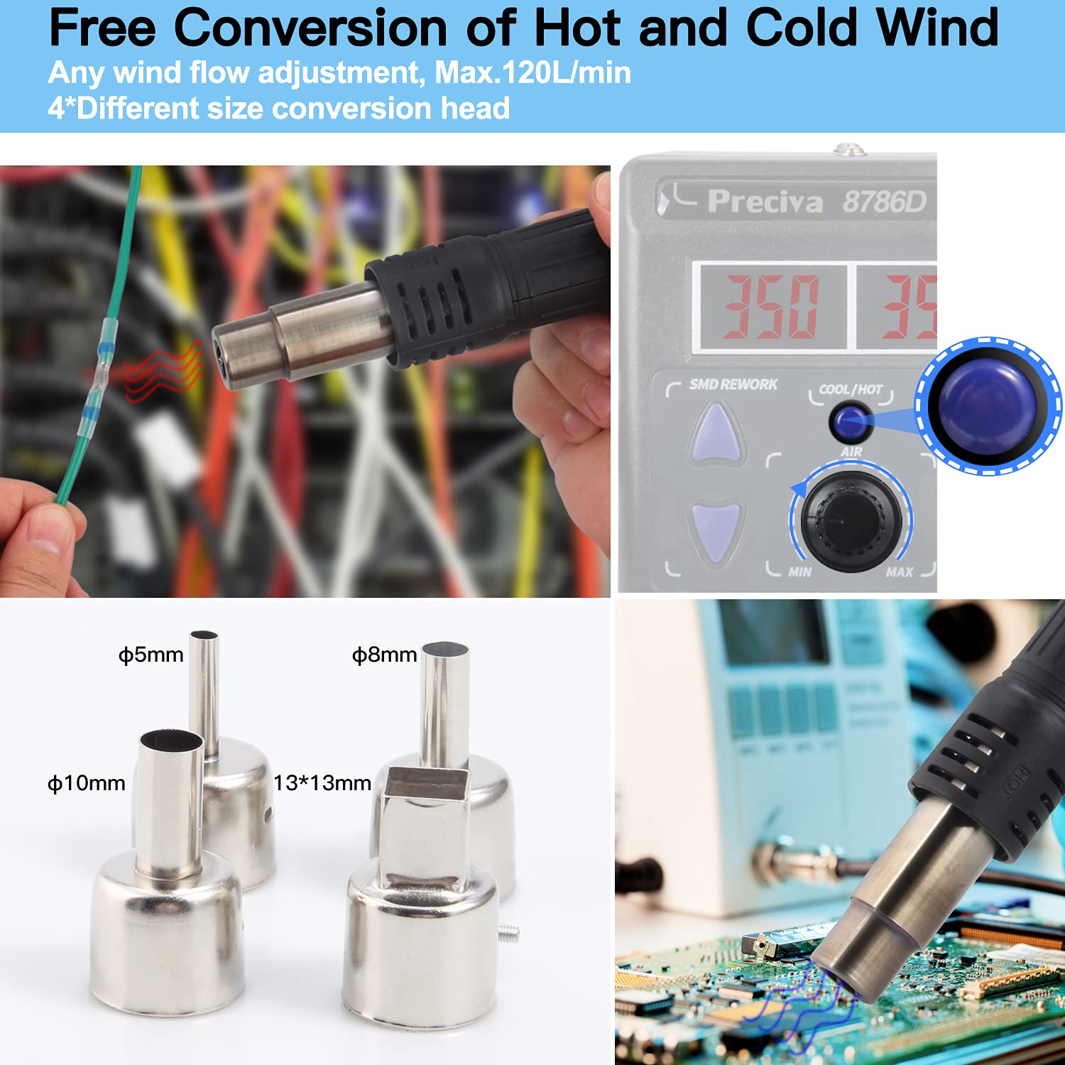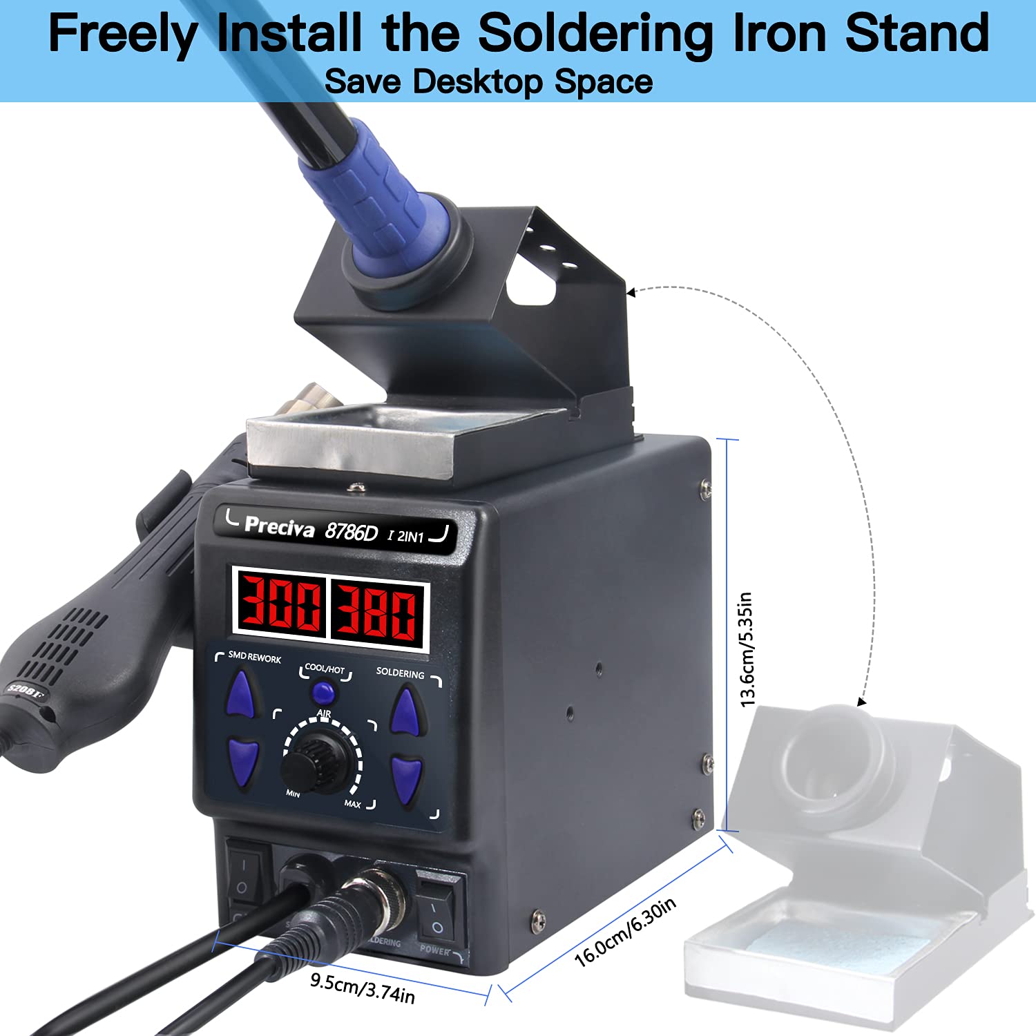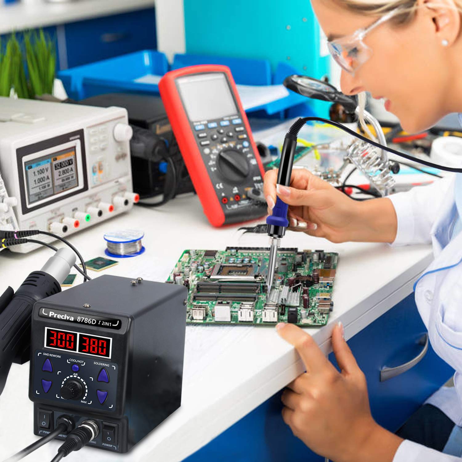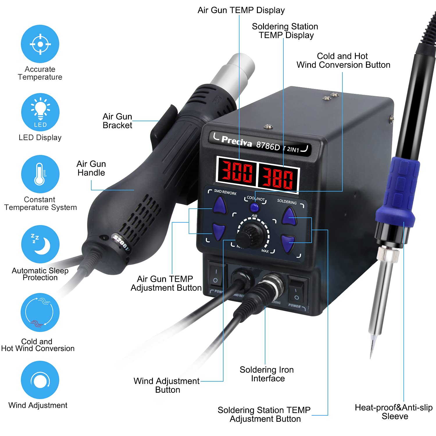Die Preciva 8786D ist eine multifunktionale Heissluft-Lötstation, die für anspruchsvolle Löt- und Entlötarbeiten entwickelt wurde. Sie kombiniert einen leistungsstarken Lötkolben mit einer präzisen Heissluftpistole in einem kompakten Gerät.