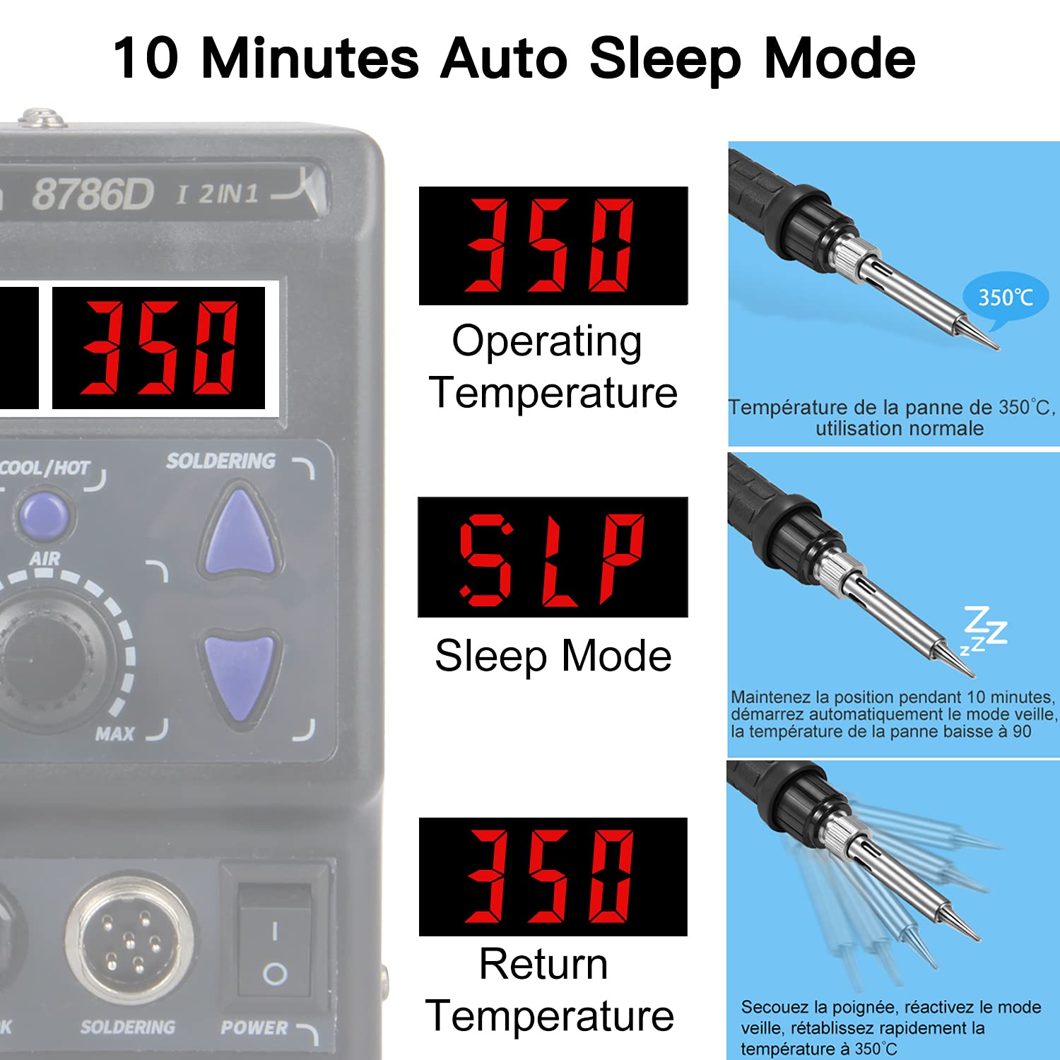 - Intelligente Schlaffunktion: Nach 10 Minuten Inaktivität wechselt der Lötkolben automatisch in einen Standby-Modus und senkt die Temperatur auf 200 °C. Dies schont die Lötspitze sowie das Heizelement und verlängert deren Lebensdauer erheblich.