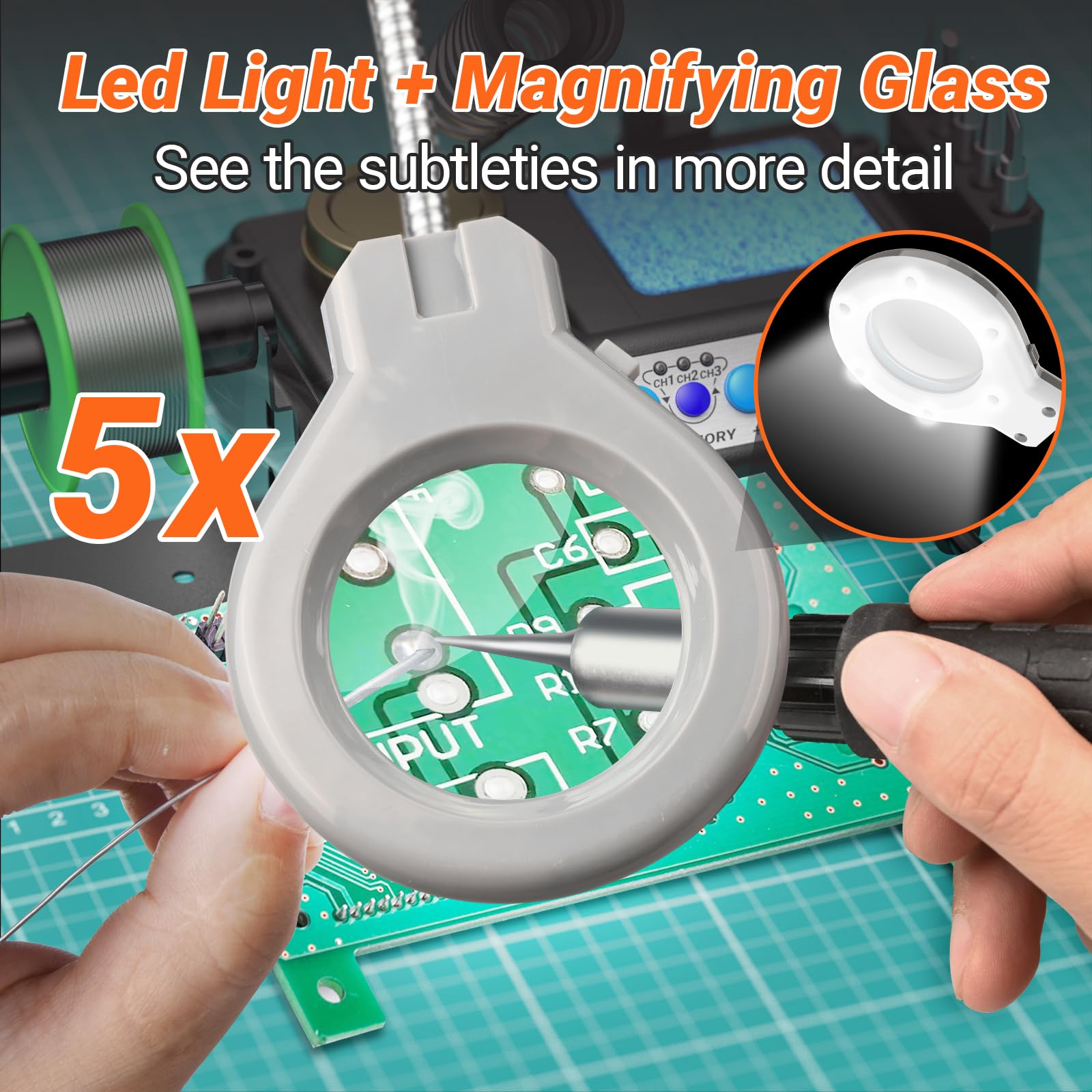 - Komfort für feine Operationen: Die Kombination aus Lupe, Beleuchtung und Halteklammern gibt Ihnen die volle Kontrolle und beste Sichtbarkeit, um auch kleinste Platinen präzise und sicher zu bearbeiten.