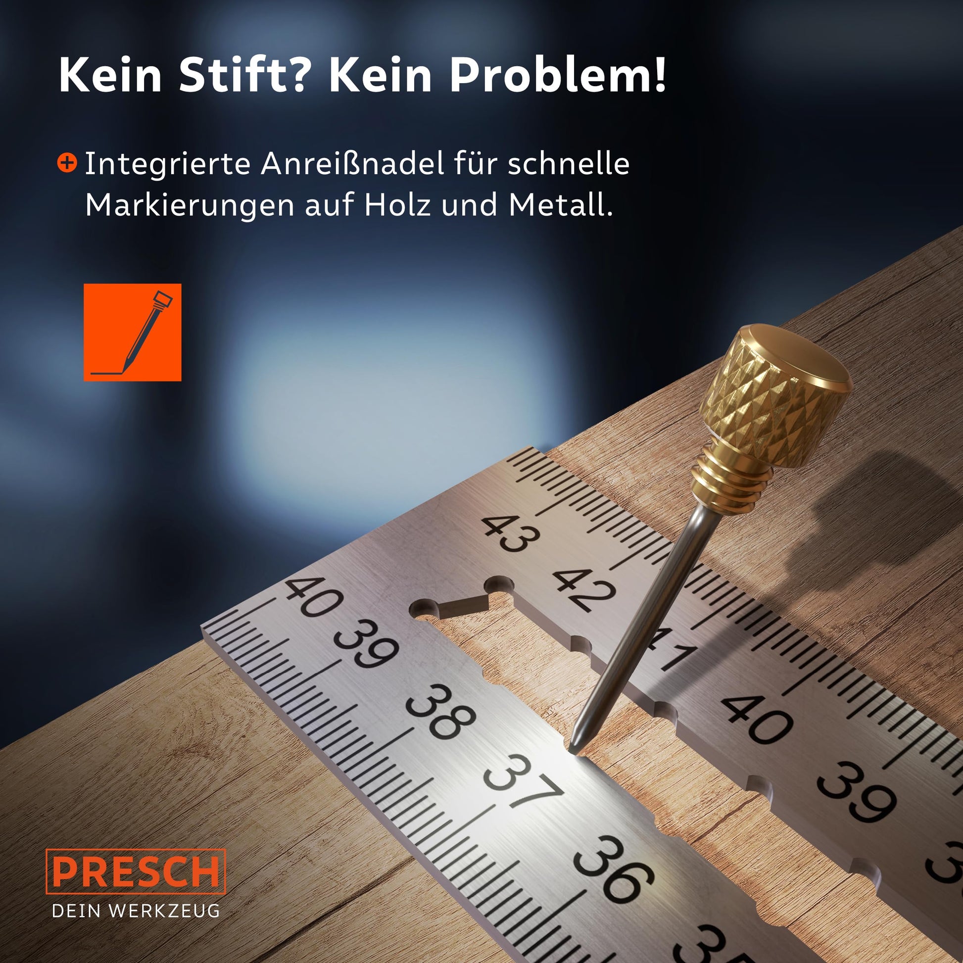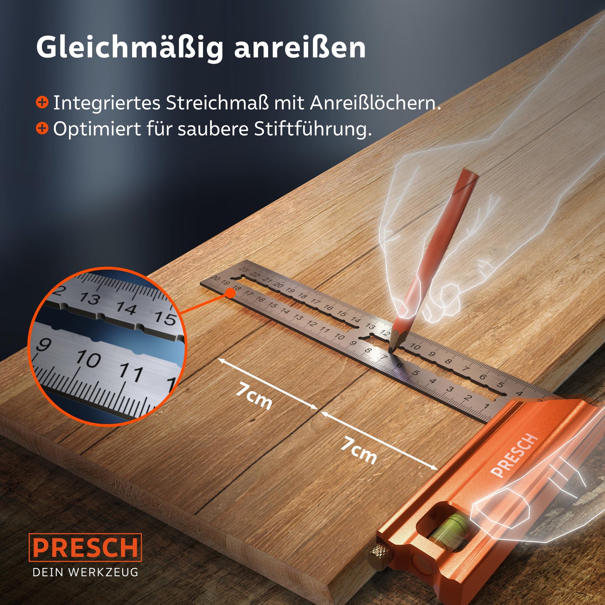 Das Presch Anschlagwinkel-Set ist die multifunktionale Lösung für alle, die in der Werkstatt Wert auf höchste Präzision und Effizienz legen. Es vereint mehrere unverzichtbare Werkzeuge in einem durchdachten, rostfreien Design.