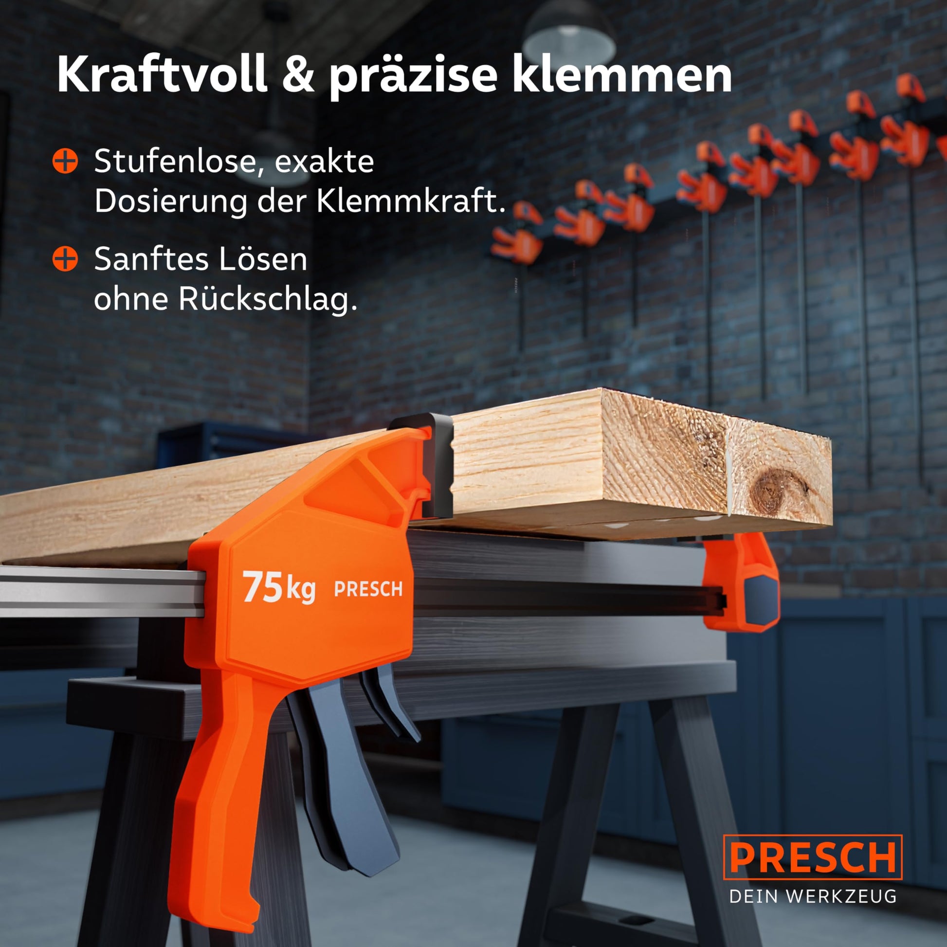 - Zuverlässige Spannkraft: Mit einer Kraft von 75 kg halten diese Schnellspannzwingen Leisten, Platten und Bauteile sicher in Position.
