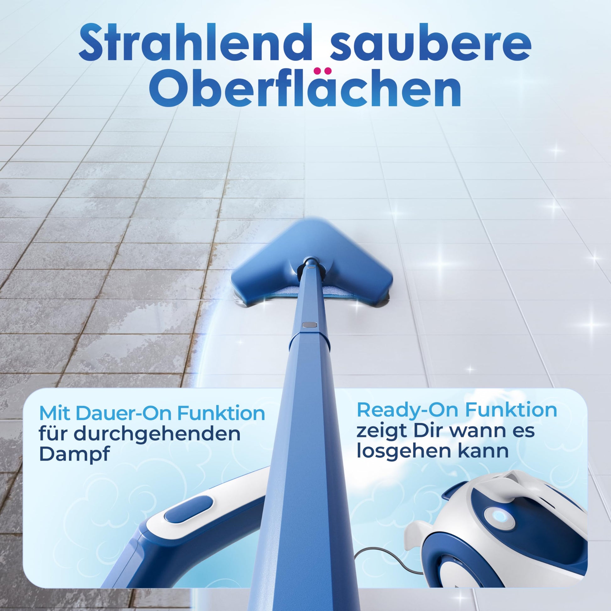 - Lange Einsatzdauer: Der grosszügige 1500-ml-Wassertank liefert bis zu 45 Minuten konstanten Dampf. So können Sie auch grössere Flächen effizient und ohne häufiges Nachfüllen reinigen.
