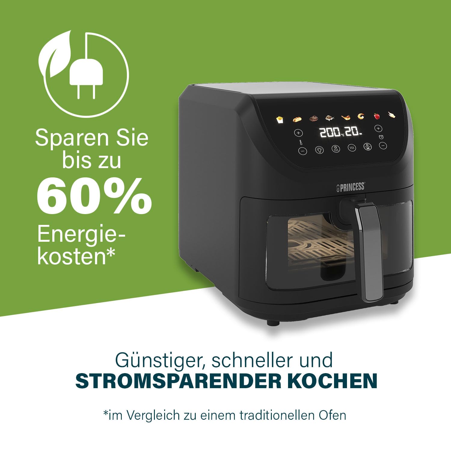 - Moderne Heisslufttechnologie: Dient zum fettarmen Frittieren, Grillen und Backen Ihrer Lieblingsspeisen.