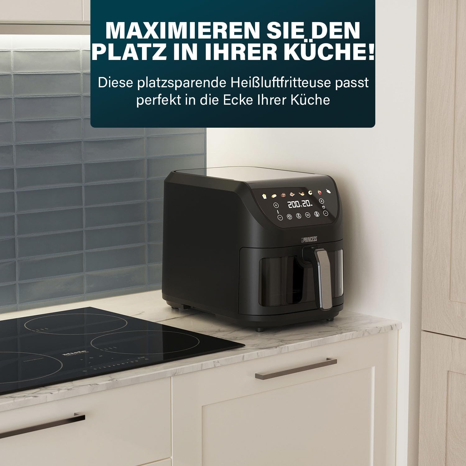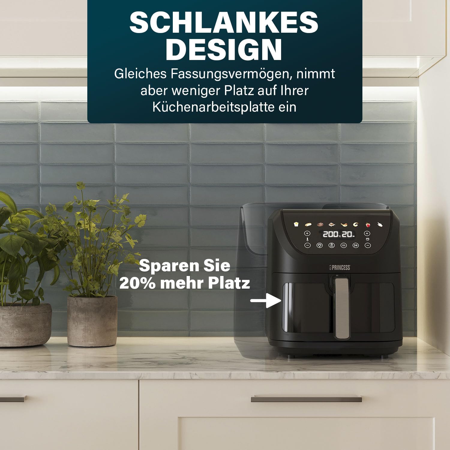Trotz seines grossen 8-Liter-Volumens, das problemlos Mahlzeiten für die ganze Familie fasst, benötigt dieser Airfryer dank seiner schlanken Bauweise erstaunlich wenig Platz. Er fügt sich nahtlos auf jede Arbeitsfläche ein und ist somit die perfekte Wahl für Küchen, in denen jeder Zentimeter zählt.
