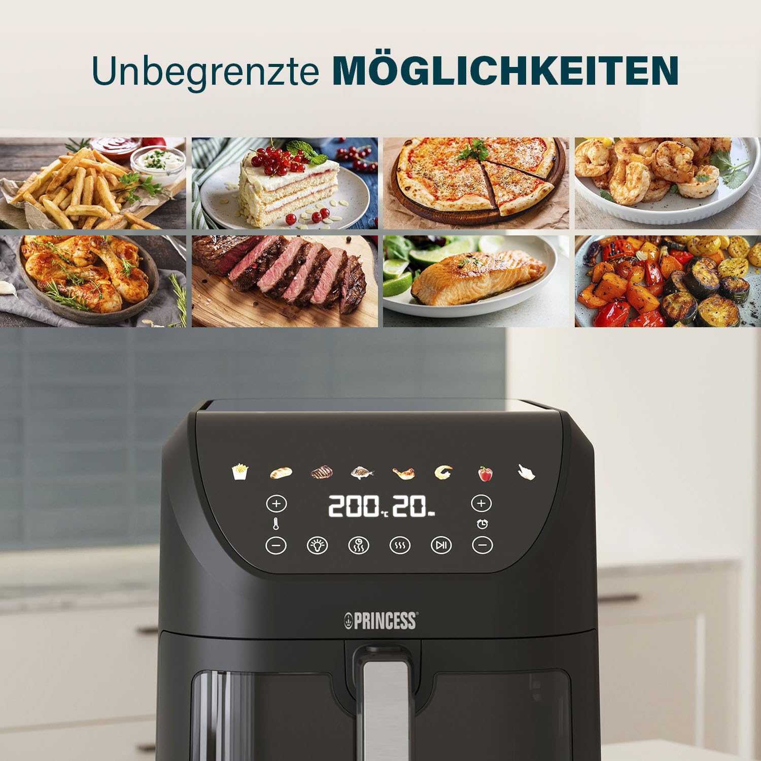 Die Bedienung ist denkbar einfach. Über das digitale Touch-Display wählen Sie eines der acht voreingestellten Programme oder stellen Temperatur (bis 200 °C) und Zeit (bis 60 Minuten) manuell ein. So gelingt jedes Rezept auf den Punkt genau und ohne grossen Aufwand.