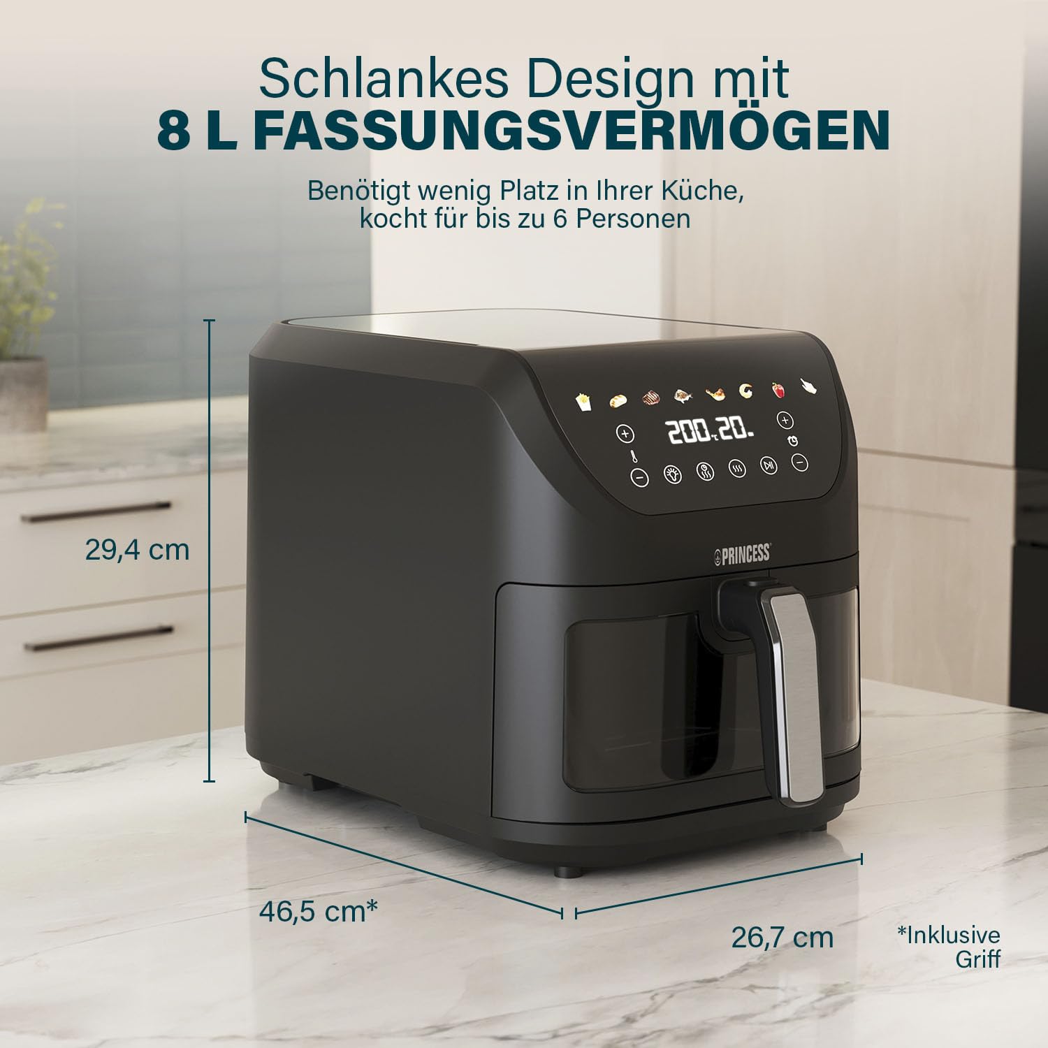 Dank seiner grosszügigen 8-Liter-Kapazität ist der Airfryer ideal, um köstliche und gesündere Mahlzeiten für die ganze Familie zuzubereiten, und passt dank seines schlanken Designs dennoch auf jede Arbeitsfläche.