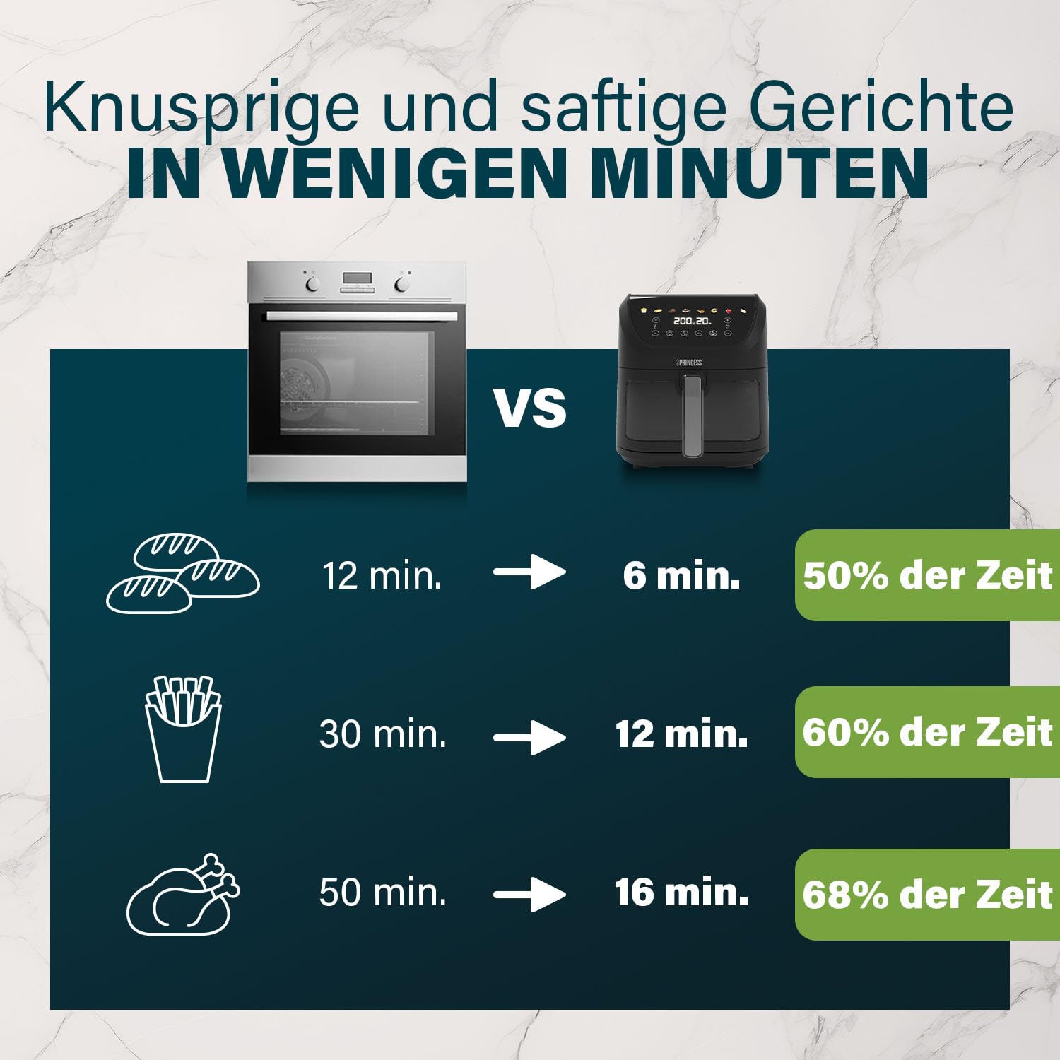 Geniessen Sie Ihre Lieblingsspeisen auf eine gesündere Art. Die leistungsstarke Heissluftzirkulation gart Pommes Frites, Poulet und mehr mit minimalem bis gar keinem Öl. Ihre Gerichte werden aussen wunderbar knusprig und bleiben innen herrlich saftig – für vollen Geschmack bei reduziertem Fettgehalt.