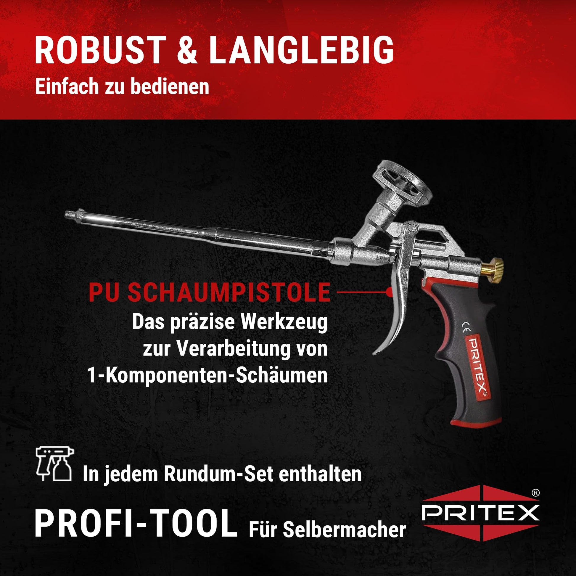 Das Set ist eine Komplettlösung und enthält 6 Dosen PRITEX Brunnenschaum (je 750 ml), eine langlebige Schaumpistole aus Metall mit gummiertem Griff und 500 ml Pistolenreiniger für die einfache Wartung und Entfernung von frischem Schaum.