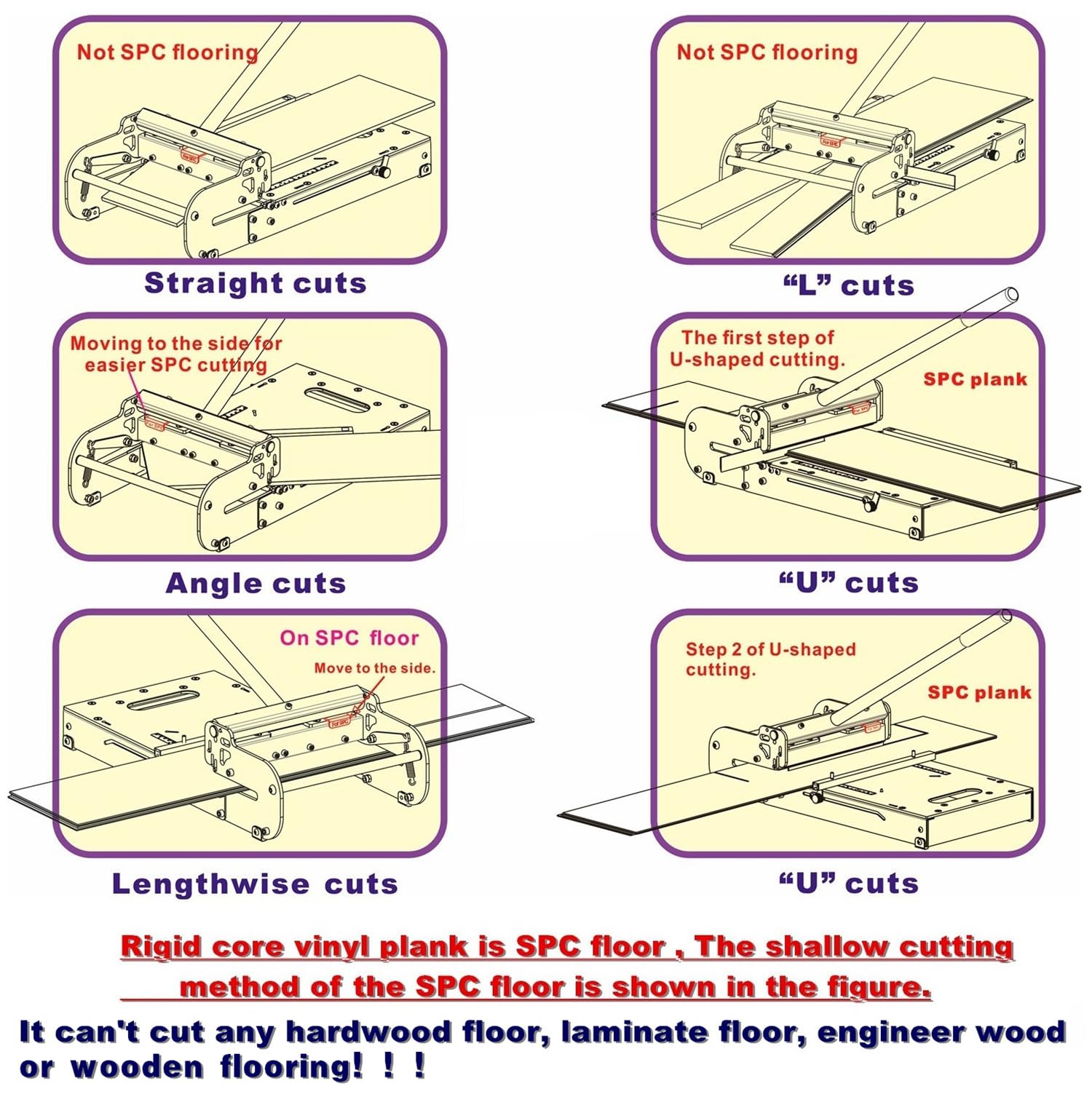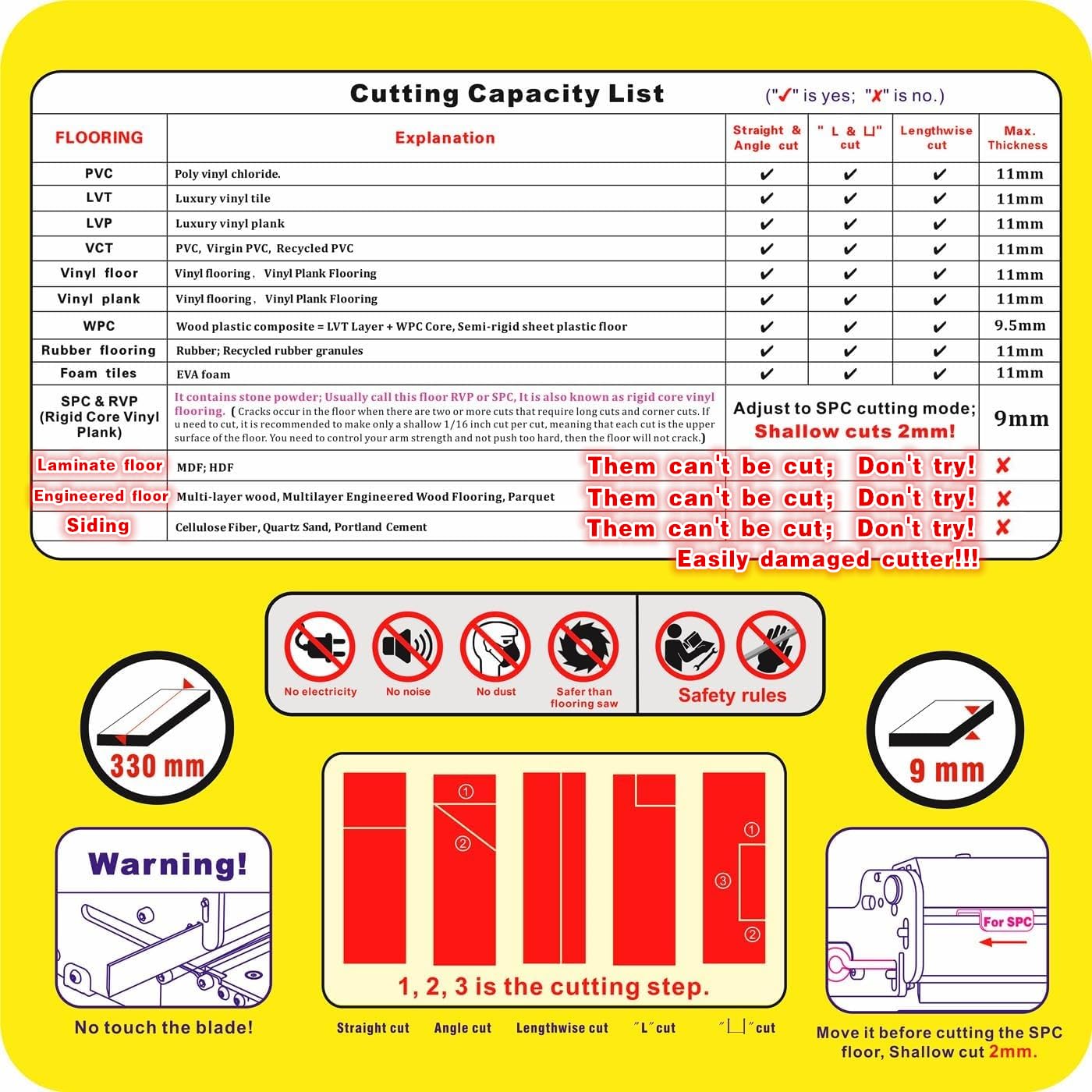 Der Vinylschneider ist speziell für moderne Vinyl-Bodenbeläge wie LVP, WPC, SPC, LVT, VCT, PVC und Vinyl-Deckplatten bis 9,5 mm Dicke konzipiert. Er ist ausdrücklich NICHT für Laminat, Parkett oder andere Holzböden geeignet, da seine Konstruktion dafür nicht ausgelegt ist und das Gerät beschädigt werden könnte.